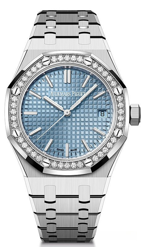 Часы Audemars Piguet Royal Oak Selfwinding 37 mm 2022 представлены в корпусе размером 37 х 8.9 мм из нержавеющей стали водонепроницаемостью 50 метров. Внутри корпуса установлен автоматический механизм, Калибр AP 5900, обладающий запасом хода 60 часов. На голубом гильошированном циферблате отображаются часы, минуты, секунды, дата. Часы поставляются на браслете из нержавеющей стали. Безель из белых бриллиантов.