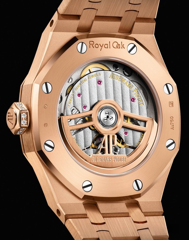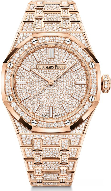 Часы Audemars Piguet Royal Oak Selfwinding 37 mm представлены в корпусе размером 37 х 9 мм из розового золота 18к водонепроницаемостью 50 метров. Внутри корпуса установлен автоматический механизм, Калибр AP 5909, обладающий запасом хода 60 часов. На циферблате с белыми бриллиантами отображаются часы, минуты, секунды. Часы поставляются на золотом браслете, инкрустированном белыми бриллиантами. Корпус инкрустирован белыми бриллиантами.