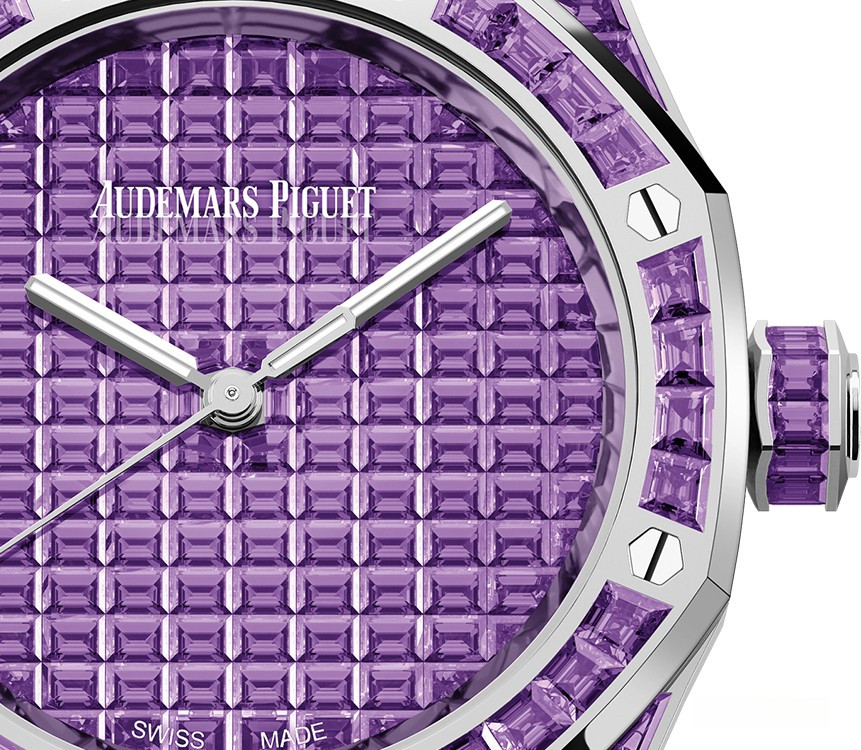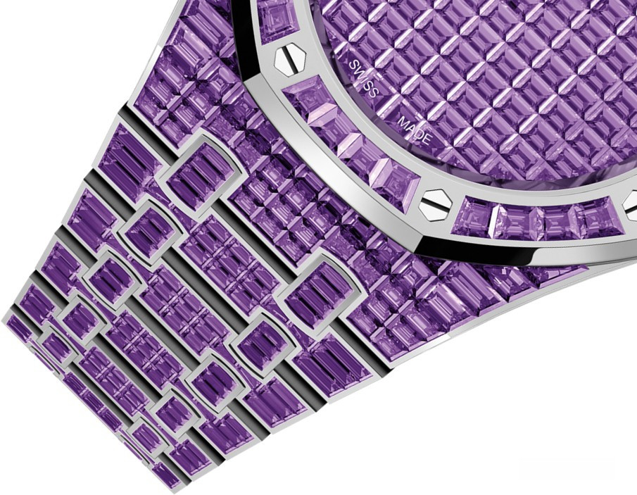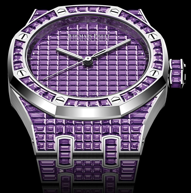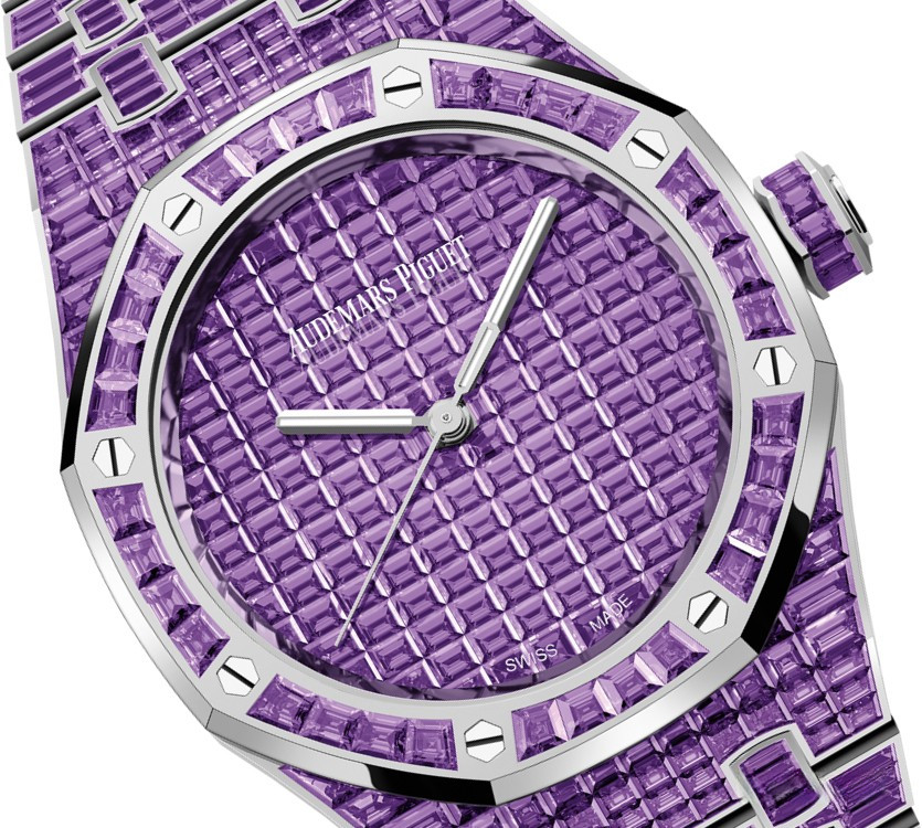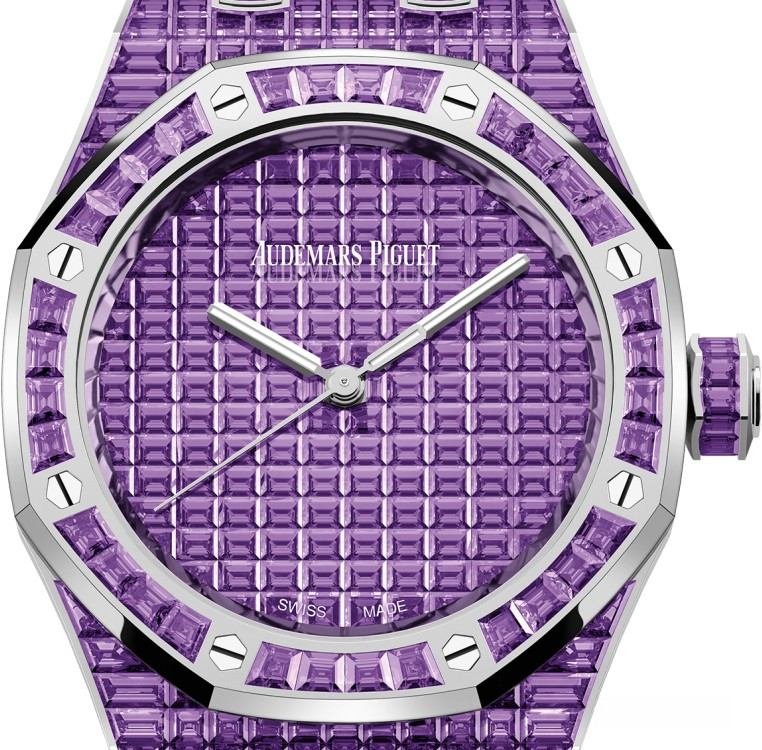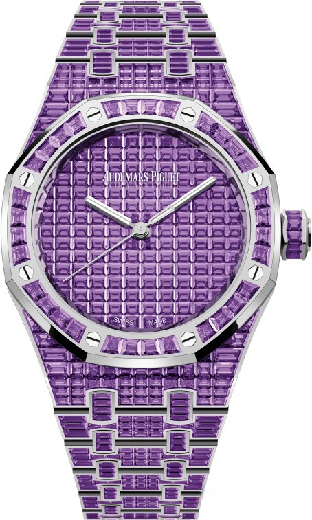 Часы Audemars Piguet Royal Oak Selfwinding 37 mm выпущены в корпусе из белого золота 18к, размером 37 х 10 мм с водонепроницаемостью 50 м. Внутри корпуса установлен автоматический механизм, Калибр АР 5909. На циферблате с багетными аметистами отображаются часы, минуты, секунды. Запас хода 60 часов. Часы комплектуются браслетом из белого золота 18к, инкрустированным багетными аметистами. Корпус инкрустирован багетными аметистами. Серия ограничена - 1 шт.