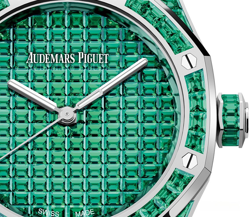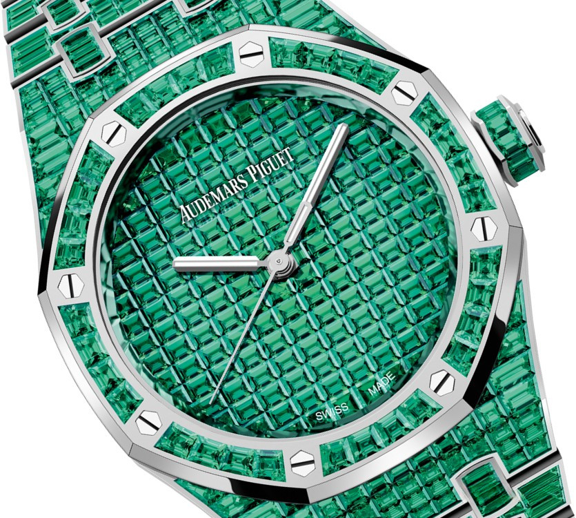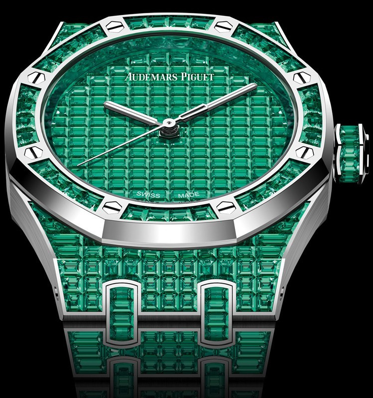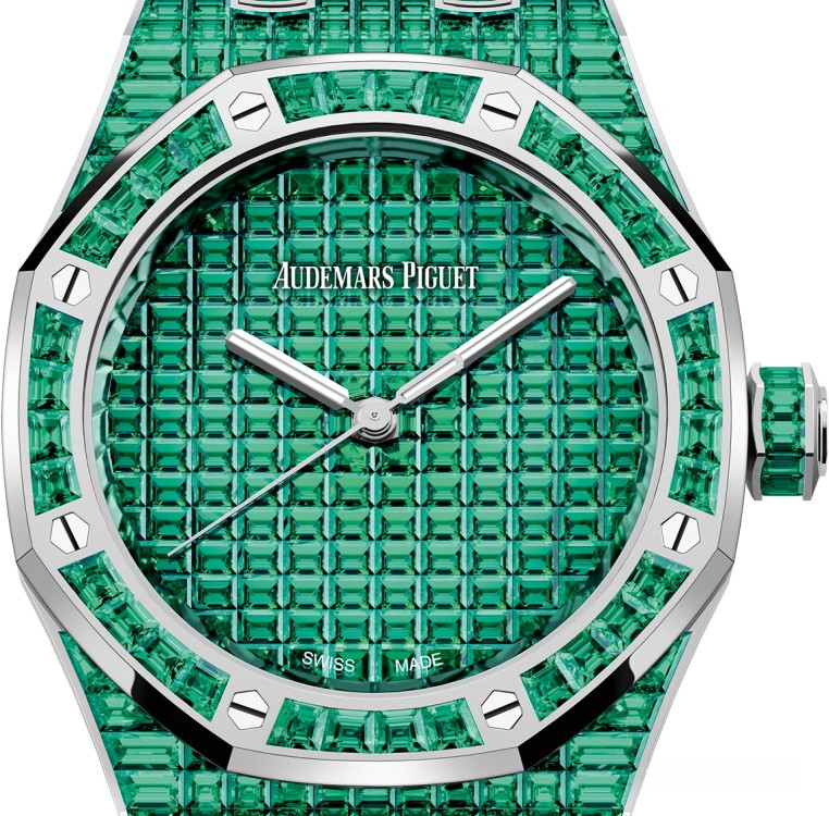 Часы Audemars Piguet Royal Oak Selfwinding 37 mm выпущены в корпусе из белого золота 18к, размером 37 х 10 мм с водонепроницаемостью 50 м. Внутри корпуса установлен автоматический механизм, Калибр АР 5909. На циферблате с багетными изумрудами отображаются часы, минуты, секунды. Запас хода 60 часов. Часы комплектуются браслетом из белого золота 18к, инкрустированным багетными изумрудами. Корпус инкрустирован багетными изумрудами. Серия ограничена - 1 шт.