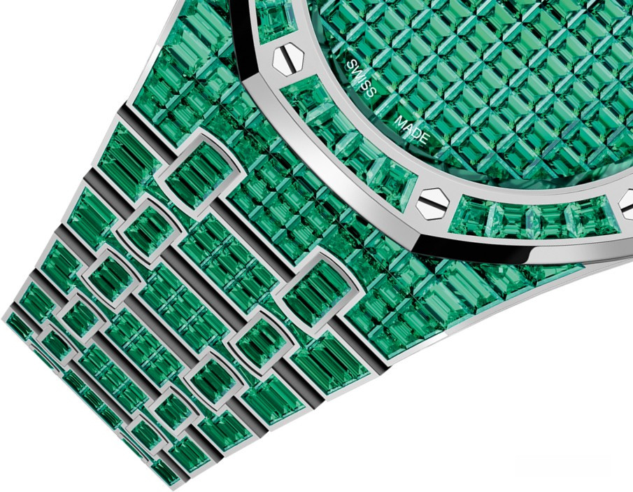 водонепроницаемость 20 м, корпус инкрустирован багетными изумрудами, серия ограничена (1 шт.)