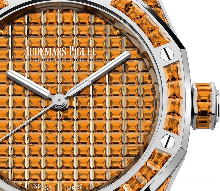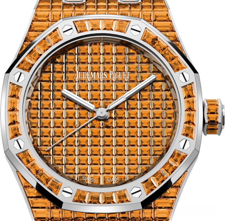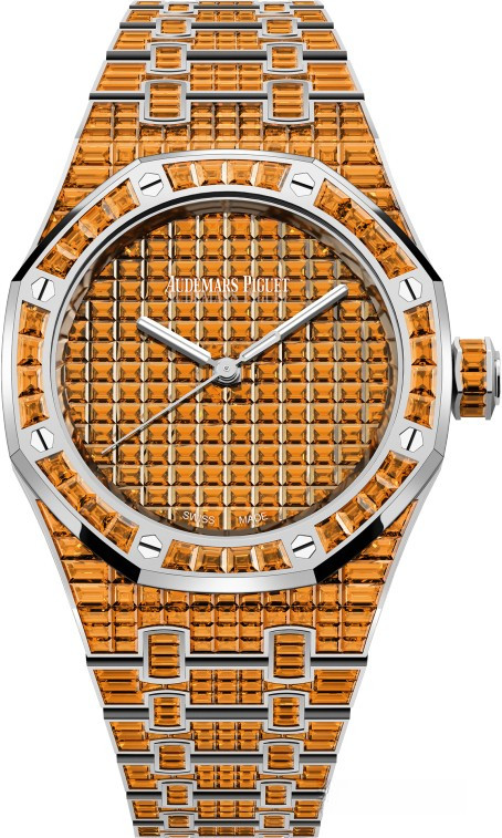 Часы Audemars Piguet Royal Oak Selfwinding 37 mm выпущены в корпусе из белого золота 18к, размером 37 х 10 мм с водонепроницаемостью 50 м. Внутри корпуса установлен автоматический механизм, Калибр АР 5909. На циферблате с багетными спессаритами отображаются часы, минуты, секунды. Запас хода 60 часов. Часы комплектуются браслетом из белого золота 18к, инкрустированным багетными спессаритами. Корпус инкрустирован багетными спессаритами. Серия ограничена - 1 шт.