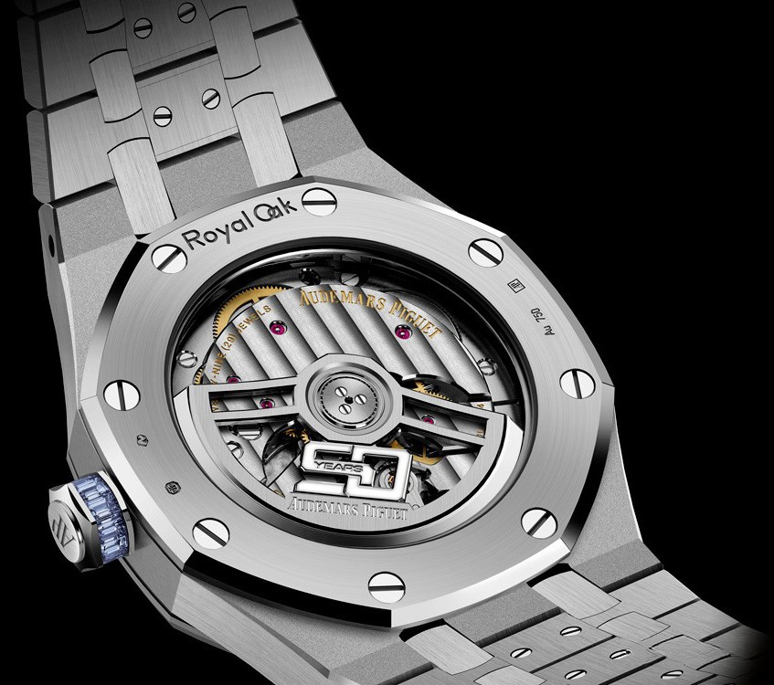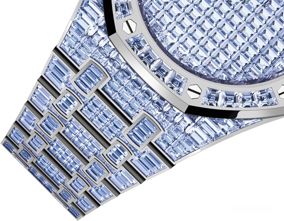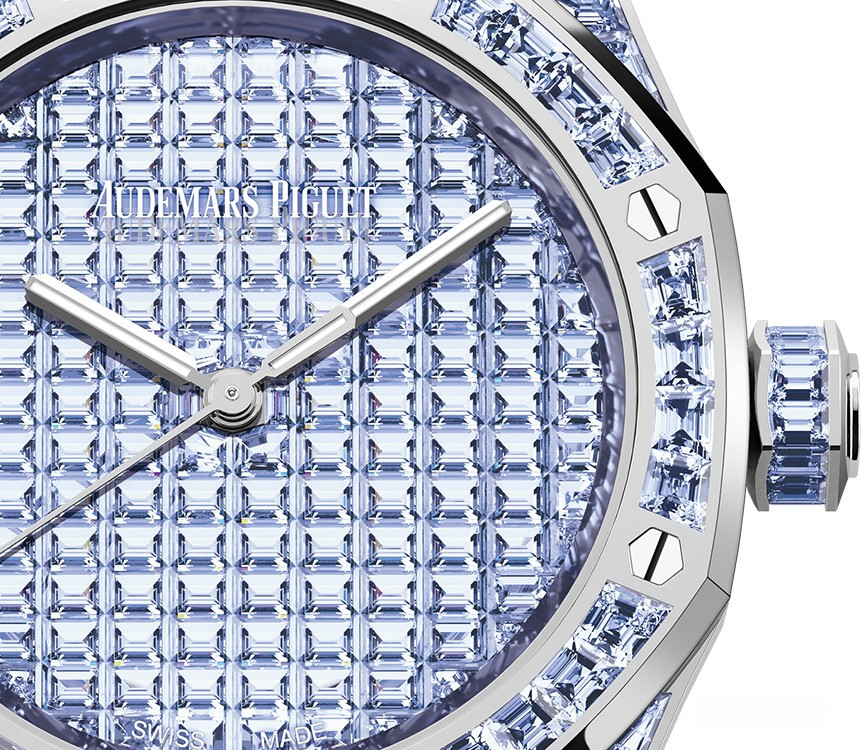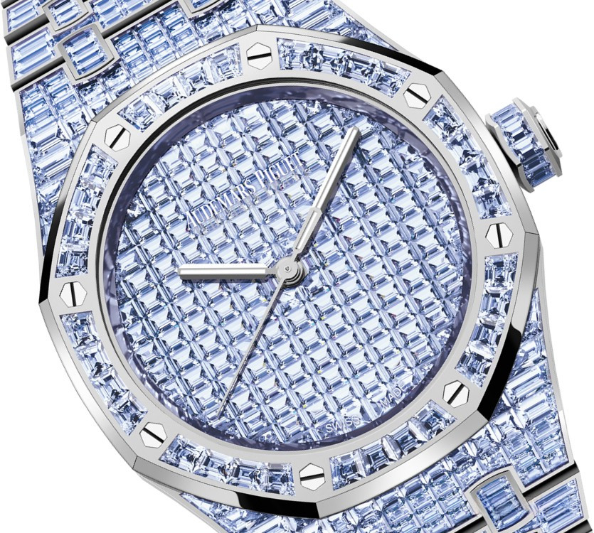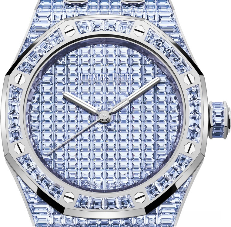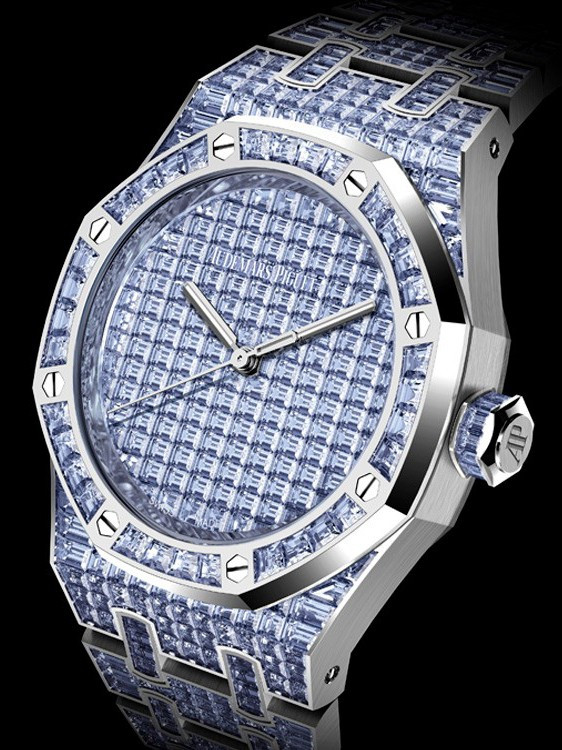 Часы Audemars Piguet Royal Oak Selfwinding 37 mm выпущены в корпусе из белого золота 18к, размером 37 х 10 мм с водонепроницаемостью 50 м. Внутри корпуса установлен автоматический механизм, Калибр АР 5909. На циферблате с багетными танзанитами отображаются часы, минуты, секунды. Запас хода 60 часов. Часы комплектуются браслетом из белого золота 18к, инкрустированным багетными танзанитами. Корпус инкрустирован багетными танзанитами. Серия ограничена - 1 шт.