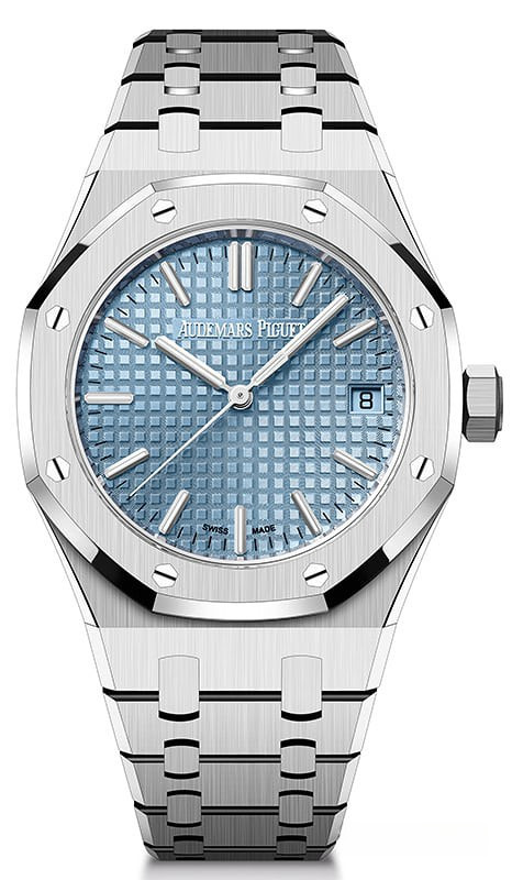 Часы Audemars Piguet Royal Oak Selfwinding 37 mm 2022 представлены в корпусе размером 37 х 8.9 мм из нержавеющей стали водонепроницаемостью 50 метров. Внутри корпуса установлен автоматический механизм, Калибр AP 5900, обладающий запасом хода 60 часов. На голубом гильошированном циферблате отображаются часы, минуты, секунды, дата. Часы поставляются на браслете из нержавеющей стали.