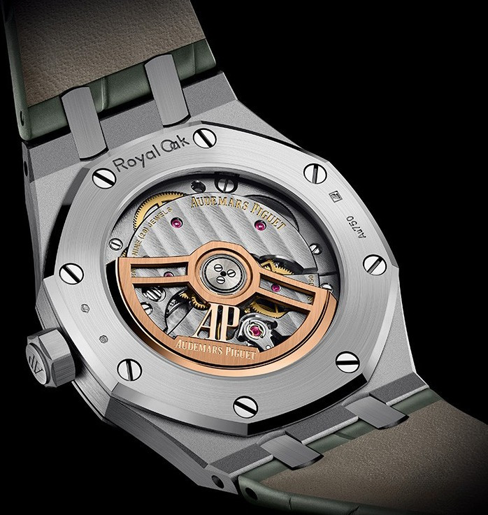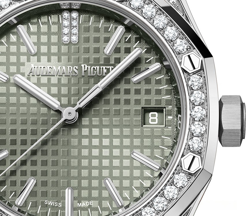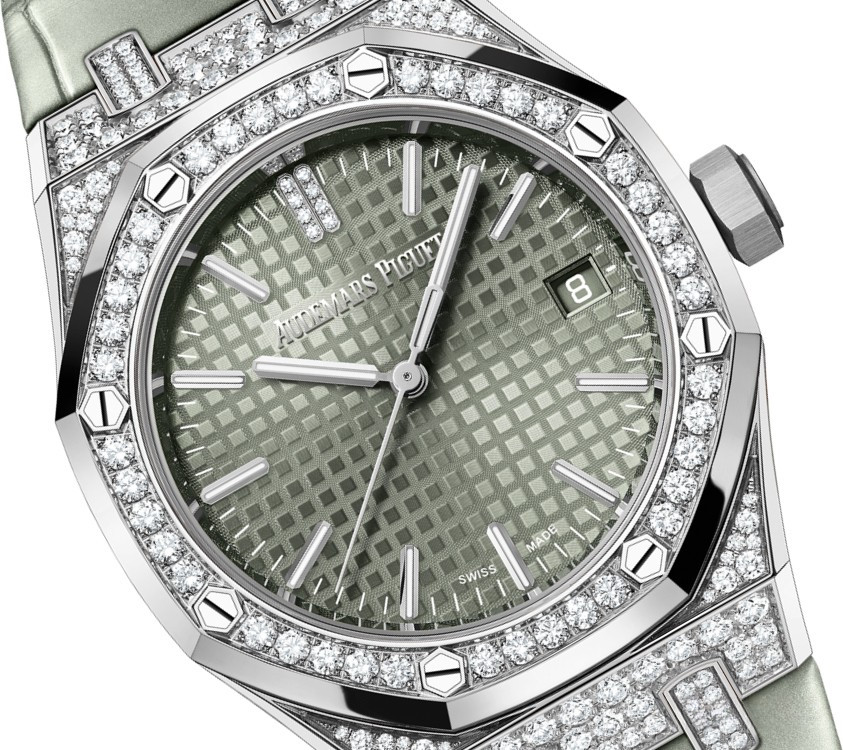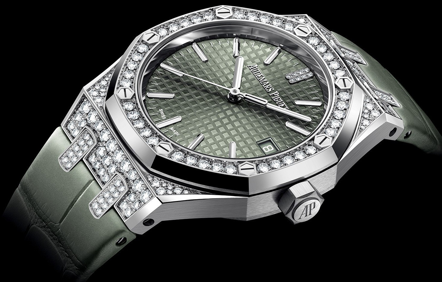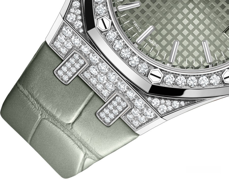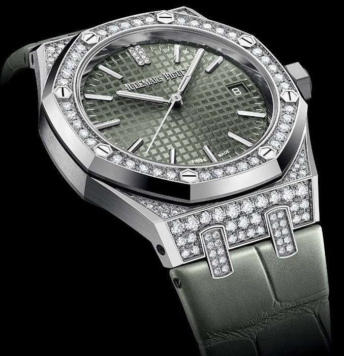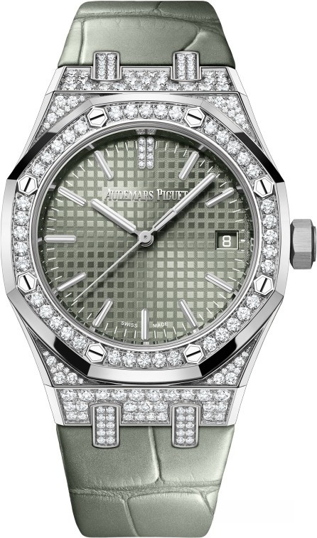 Часы Audemars Piguet Royal Oak Selfwinding 37 mm представлены в корпусе размером 37 х 9 мм из белого золота 18к водонепроницаемостью 50 метров. Внутри корпуса установлен автоматический механизм, Калибр AP 5900, обладающий запасом хода 60 часов. На зеленом гильошированном циферблате с белыми бриллиантами отображаются часы, минуты, секунды, дата. Часы поставляются на ремешке из кожи аллигатора с золотой застежкой. Корпус инкрустирован белыми бриллиантами.