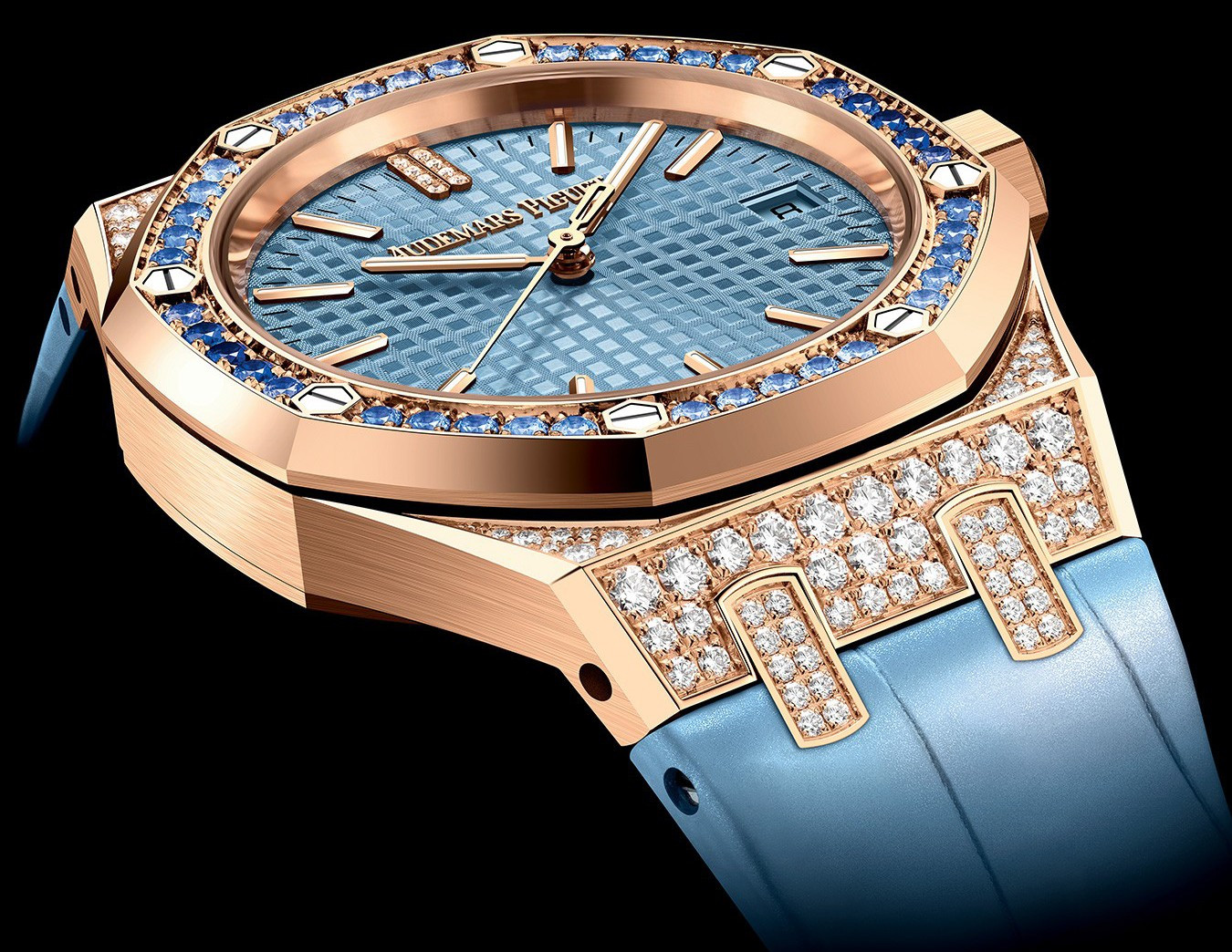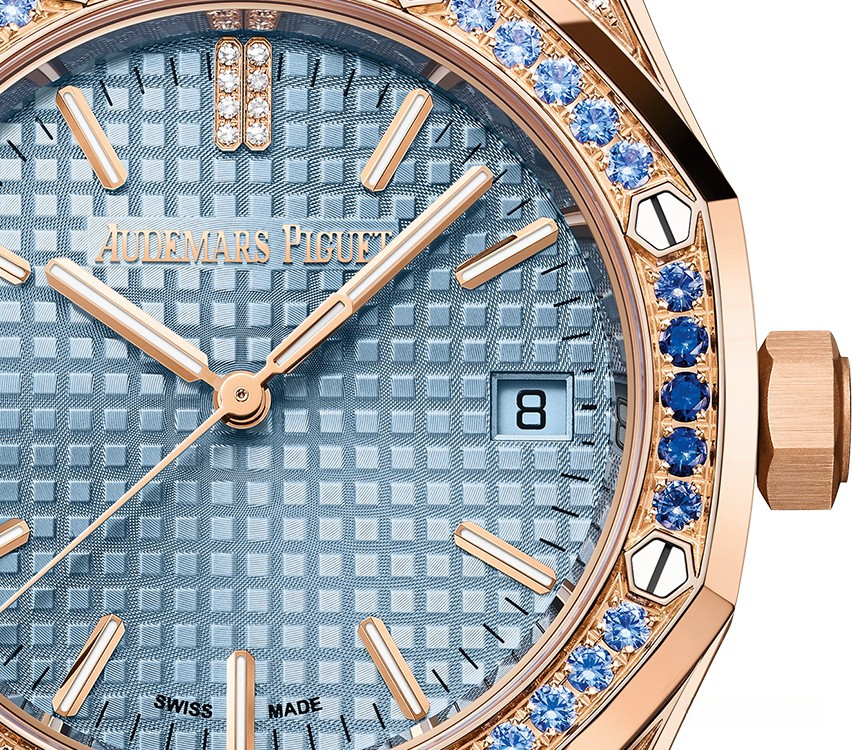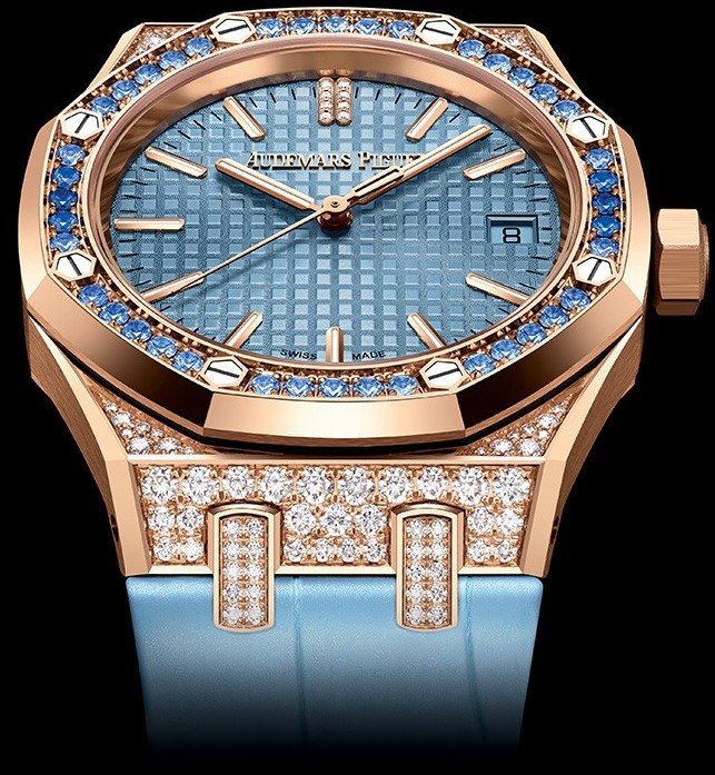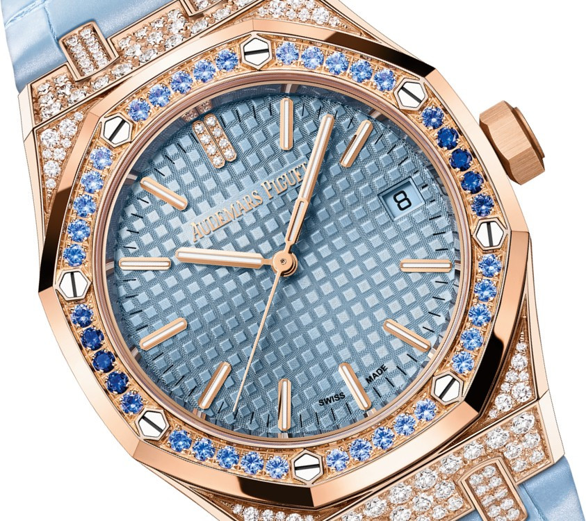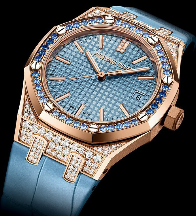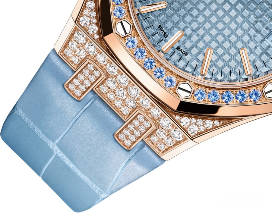 Часы Audemars Piguet Royal Oak Selfwinding 37 mm представлены в корпусе размером 37 х 9 мм из розового золота 18к водонепроницаемостью 50 метров. Внутри корпуса установлен автоматический механизм, Калибр AP 5900, обладающий запасом хода 60 часов. На голубом гильошированном циферблате с белыми бриллиантами отображаются часы, минуты, секунды, дата. Часы поставляются на ремешке из кожи аллигатора с золотой застежкой. Корпус инкрустирован белыми бриллиантами и голубыми сапфирами.