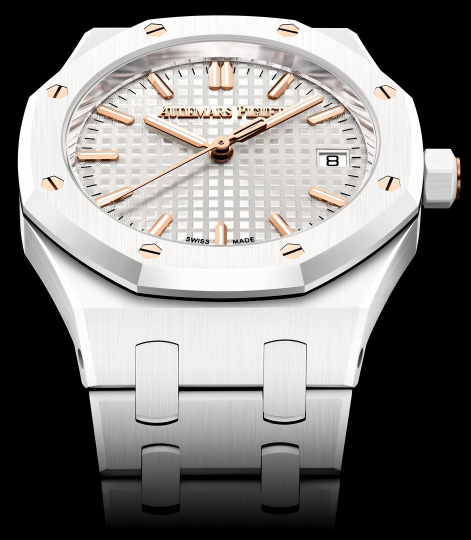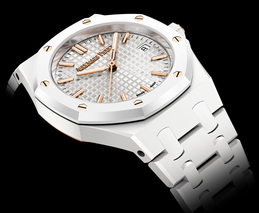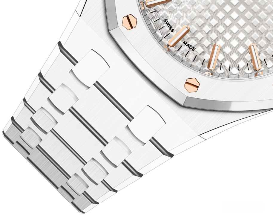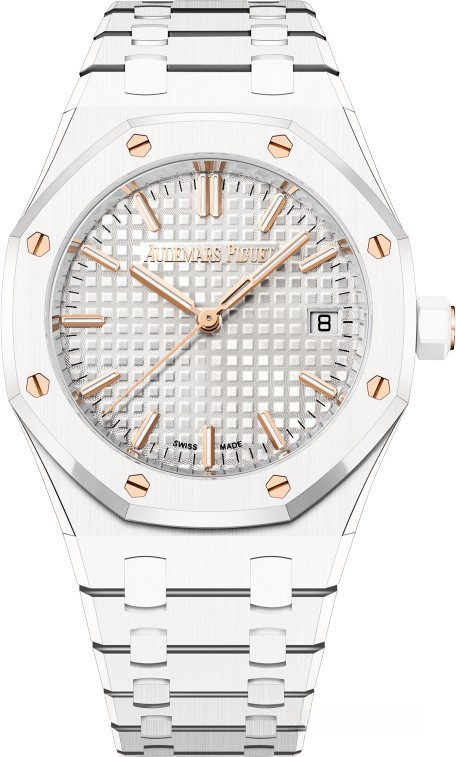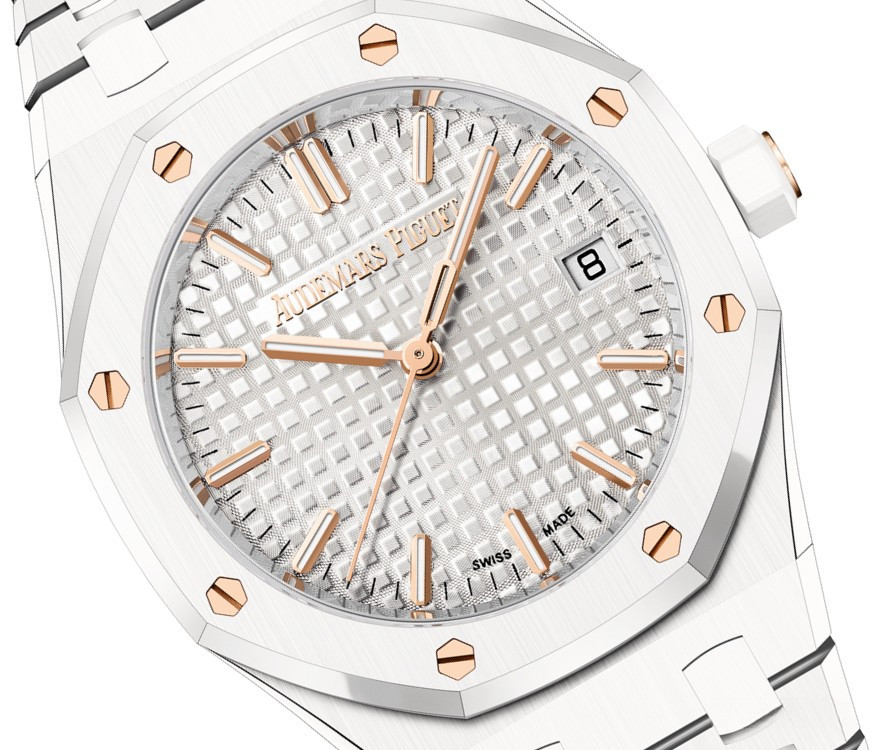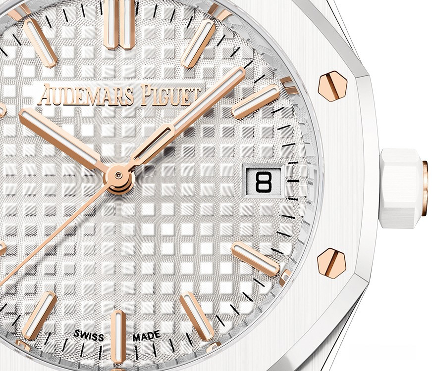 Часы Audemars Piguet Royal Oak Selfwinding 34 mm представлены в корпусе из керамики размером 34 х 8.8 мм водонепроницаемостью 50 метров. Внутри корпуса находится автоматический механизм, Калибр 5800, обладающий запасом хода 50 часов. На серебристом циферблате отображаются часы, минуты, секунды, дата. Часы поставляются на браслете из керамики.