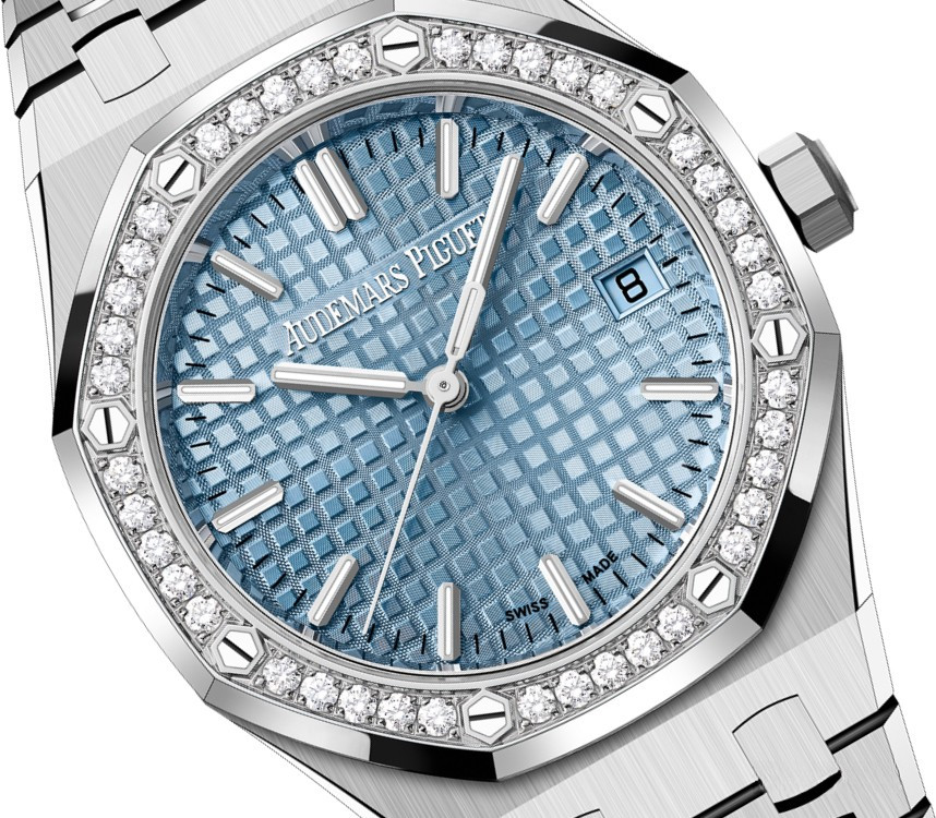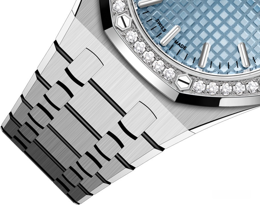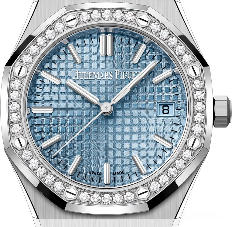 Часы Audemars Piguet Royal Oak Selfwinding 34 mm представлены в корпусе из нержавеющей стали размером 34 х 8.8 мм водонепроницаемостью 50 метров. Внутри корпуса находится автоматический механизм, Калибр 5800, обладающий запасом хода 50 часов. На голубом циферблате отображаются часы, минуты, секунды, дата. Часы поставляются на браслете из нержавеющей стали. Безель из белых бриллиантов.