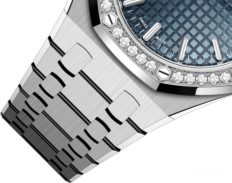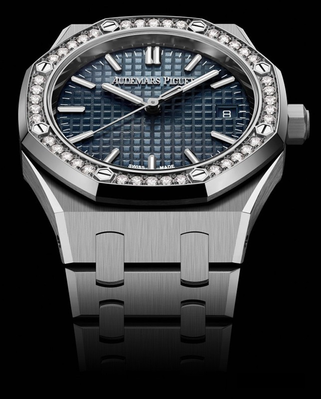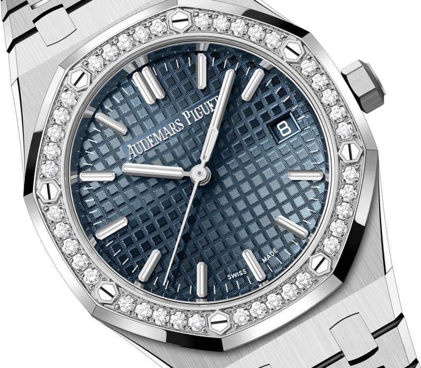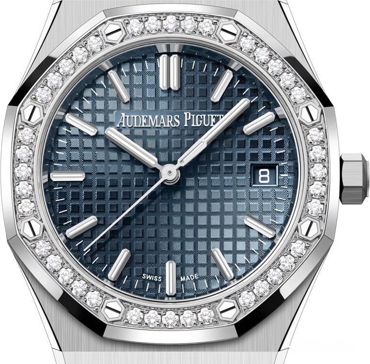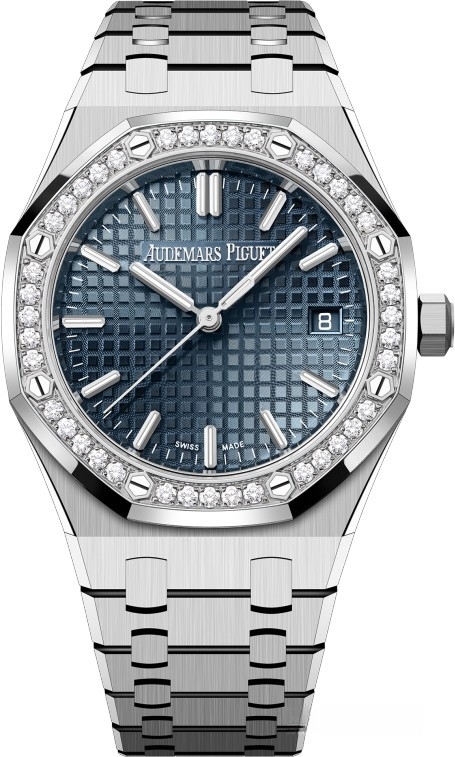 Часы Audemars Piguet Royal Oak Selfwinding 34 mm представлены в корпусе из нержавеющей стали размером 34 х 8.8 мм водонепроницаемостью 50 метров. Внутри корпуса находится автоматический механизм, Калибр 5800, обладающий запасом хода 50 часов. На синем циферблате отображаются часы, минуты, секунды, дата. Часы поставляются на браслете из нержавеющей стали. Безель из белых бриллиантов.