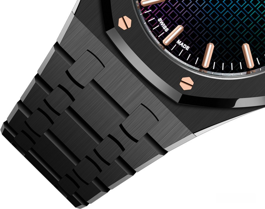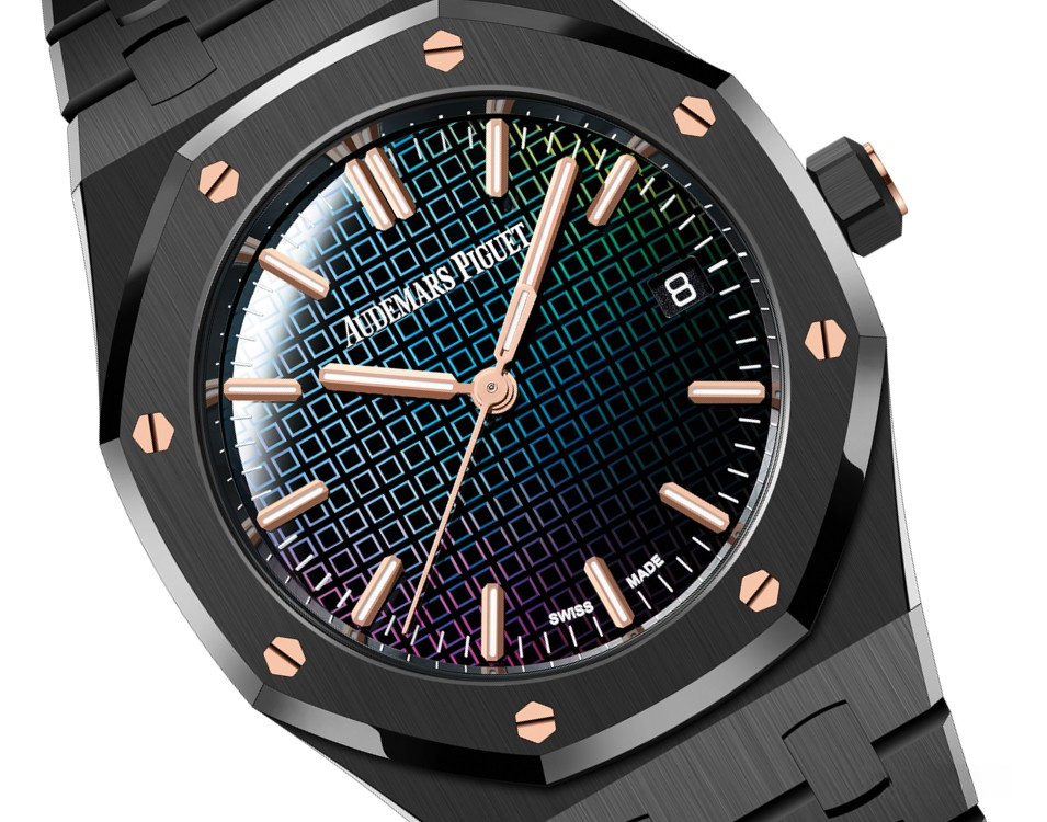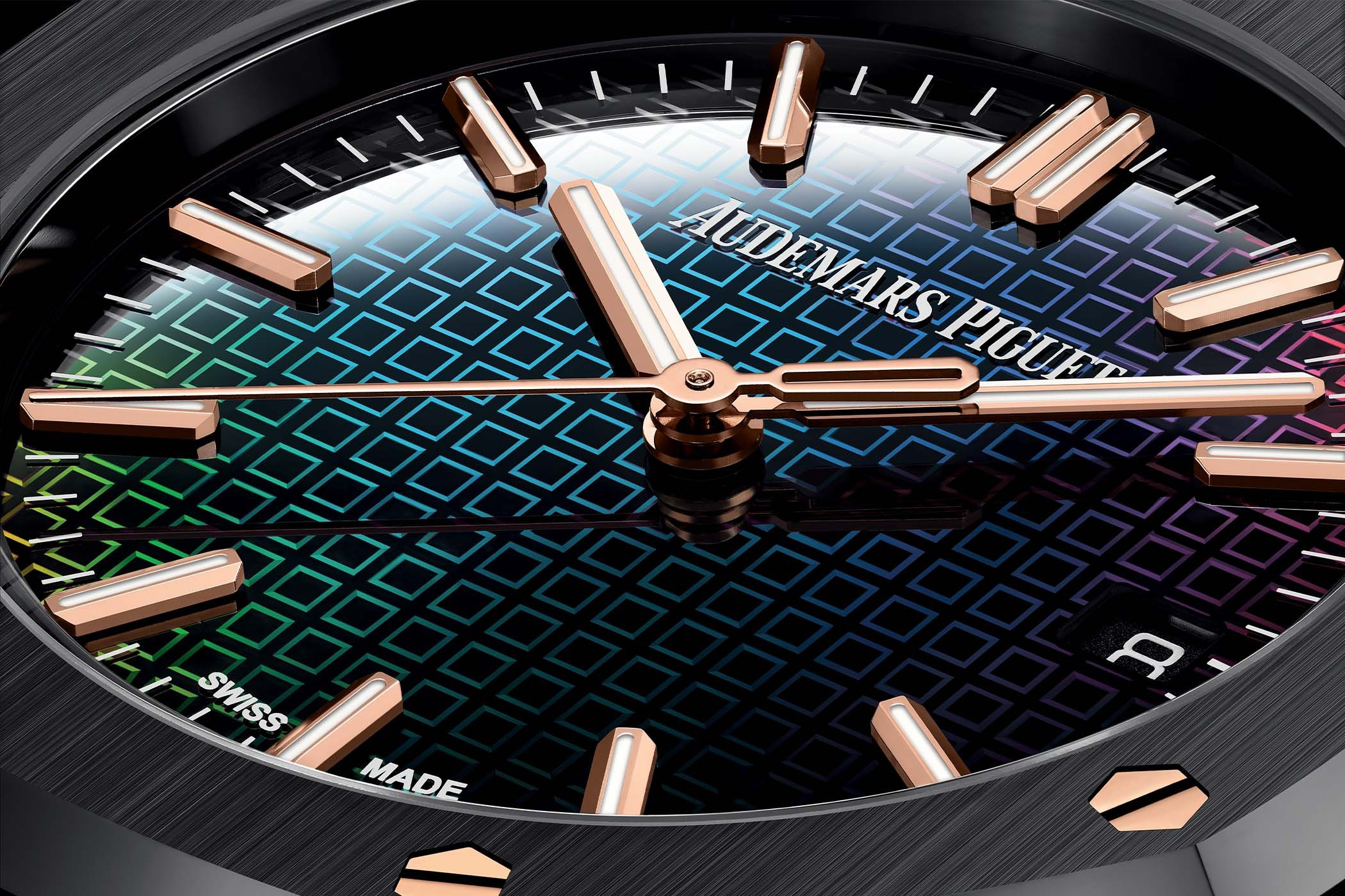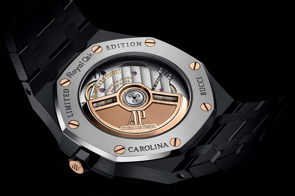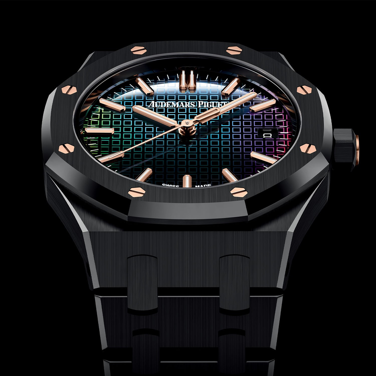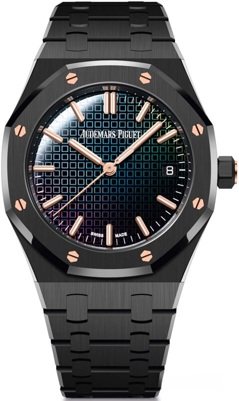 Часы Audemars Piguet Royal Oak Selfwinding 34 mm представлены в корпусе из керамики размером 34 х 8.8 мм водонепроницаемостью 50 метров. Внутри корпуса находится автоматический механизм, Калибр 5800, обладающий запасом хода 50 часов. На черном циферблате отображаются часы, минуты, секунды, дата. Часы поставляются на браслете из керамики. Серия огранчена - 300 шт.