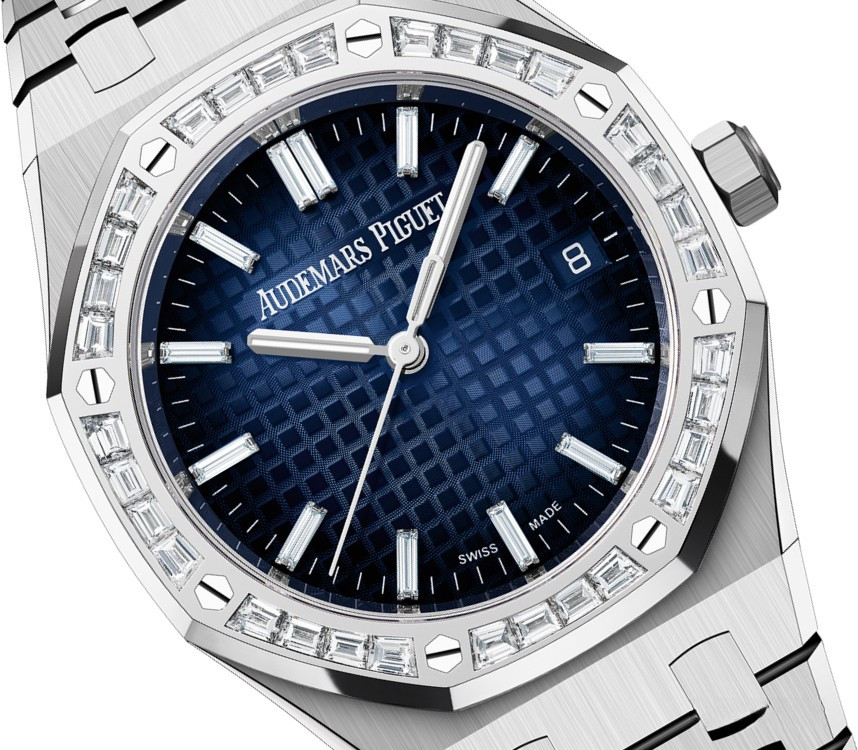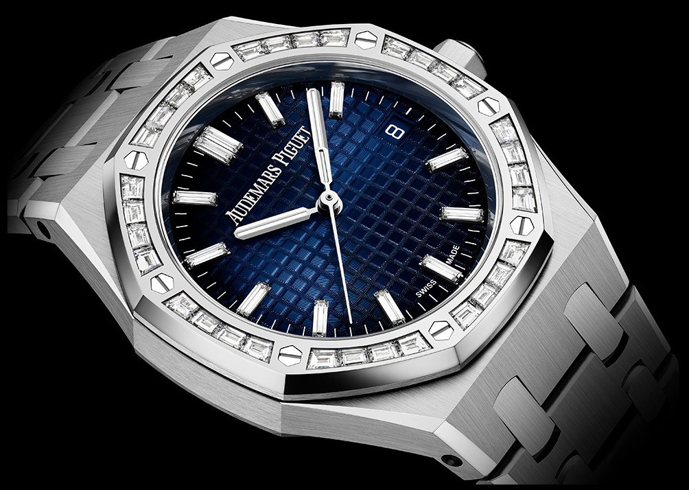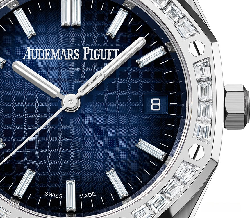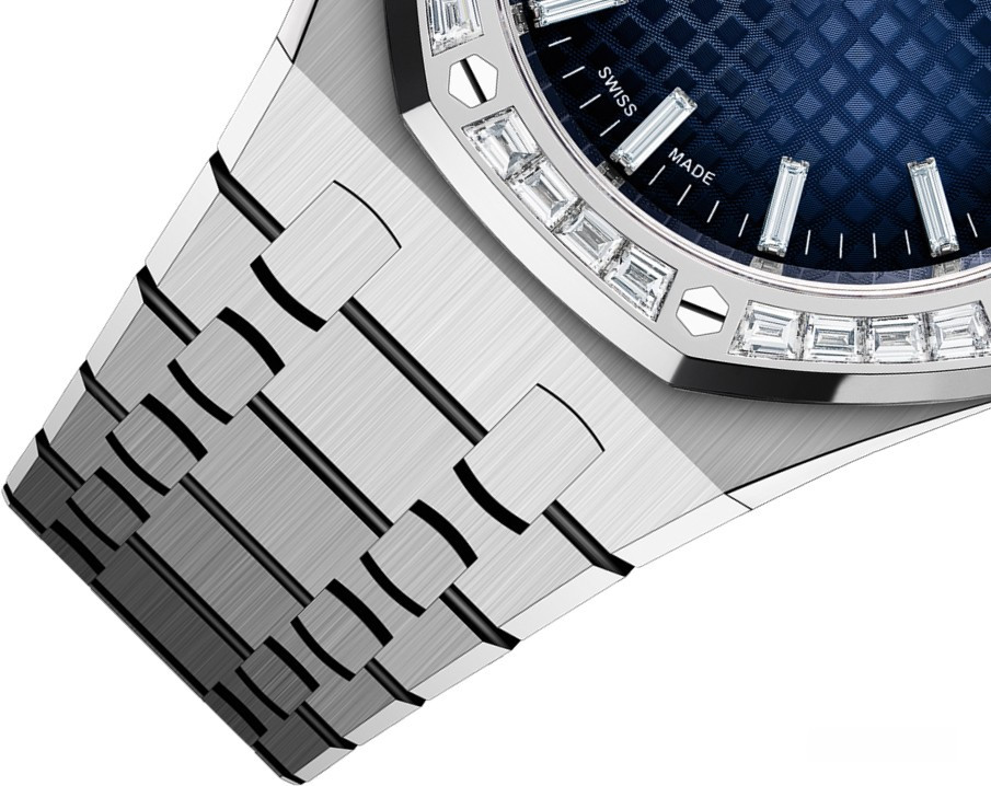 Часы Audemars Piguet Royal Oak Selfwinding 34 mm представлены в корпусе из белого золота 18к размером 34 х 8.8 мм водонепроницаемостью 50 метров. Внутри корпуса находится автоматический механизм, Калибр 5800, обладающий запасом хода 50 часов. На синем циферблате отображаются часы, минуты, секунды, дата. Часы поставляются на браслете из белого золота 18к. Безель из белых багетных бриллиантов.
