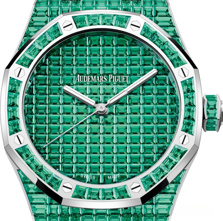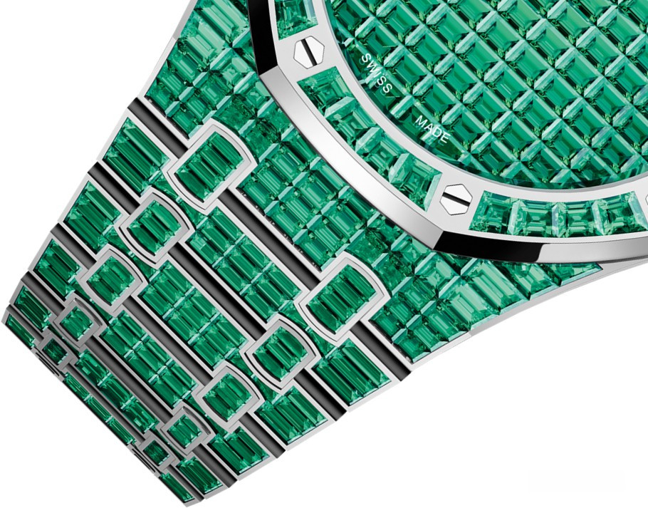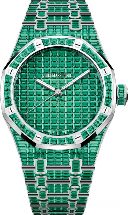 Часы Audemars Piguet Royal Oak Selfwinding 41 mm представлены в корпусе из белого золота 18к размером 41 х 11.6 мм и водонепроницеамостью 20 метров. Внутри корпуса установлен автоматический механизм, Калибр 4309, обладающий запасом хода 70 часов. На циферблате с багетными изумрудами отображаются часы, минуты, секунды. Часы комплектуются браслетом из белого золота 18к, инкрустированном багетными Изумрудами. Корпус инкрустирован багетными изумрудами. Серия ограничена - 1 шт.