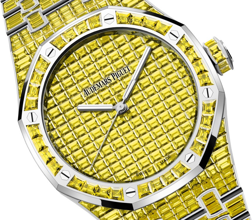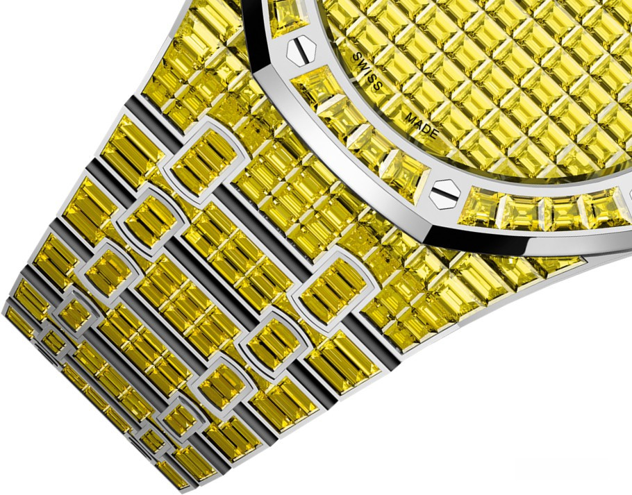 Часы Audemars Piguet Royal Oak Selfwinding 41 mm представлены в корпусе из белого золота 18к размером 41 х 11.6 мм и водонепроницеамостью 20 метров. Внутри корпуса установлен автоматический механизм, Калибр 4309, обладающий запасом хода 70 часов. На циферблате с багетными хризоберилами отображаются часы, минуты, секунды. Часы комплектуются браслетом из белого золота 18к, инкрустированном багетными хризоберилами. Корпус инкрустирован багетными хризоберилами. Серия ограничена - 1 шт.