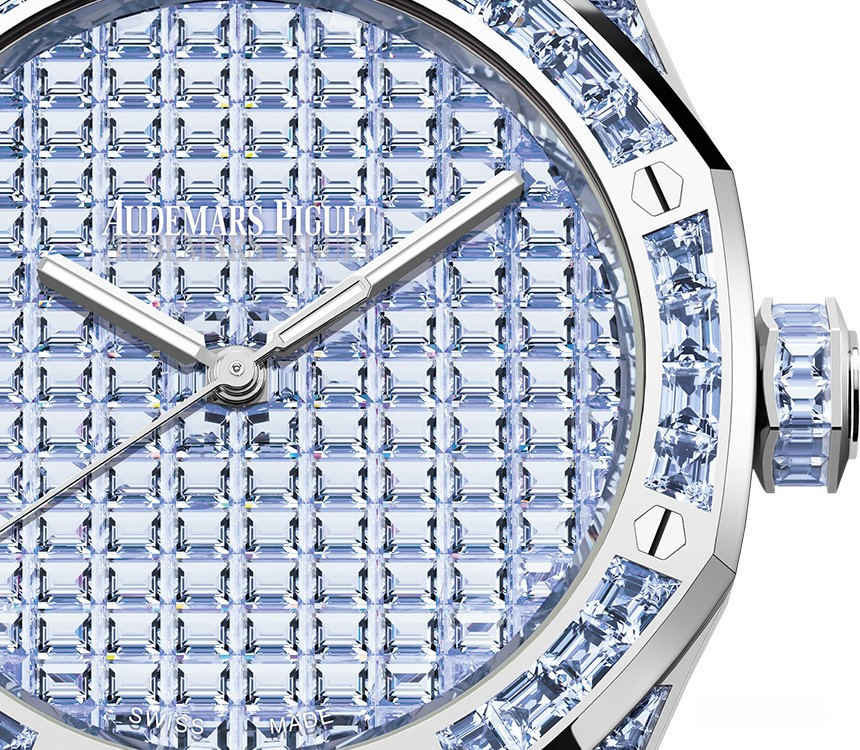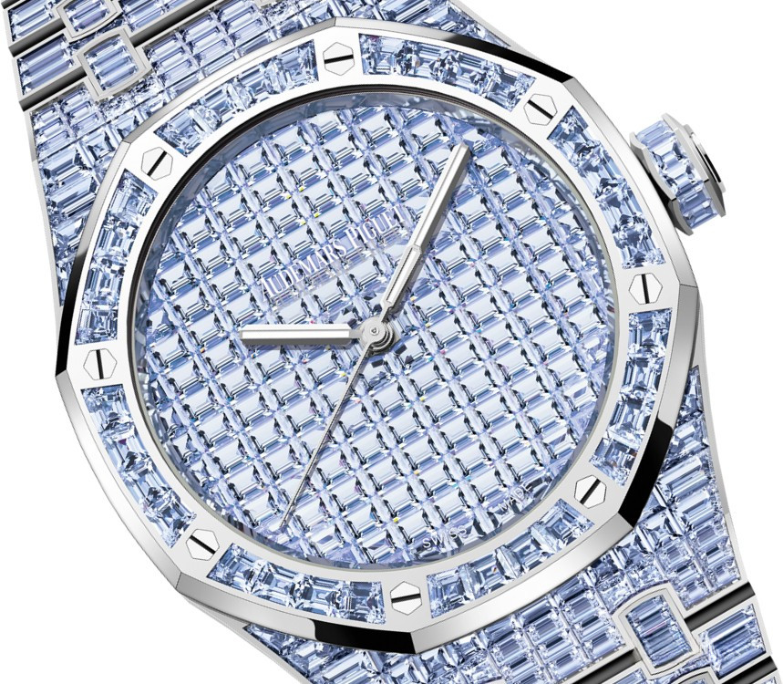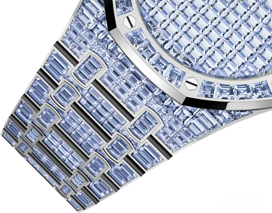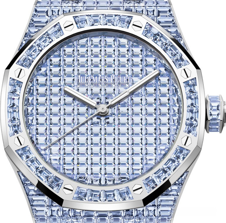 Часы Audemars Piguet Royal Oak Selfwinding 41 mm представлены в корпусе из белого золота 18к размером 41 х 11.6 мм и водонепроницеамостью 20 метров. Внутри корпуса установлен автоматический механизм, Калибр 4309, обладающий запасом хода 70 часов. На циферблате с багетными танзанитами отображаются часы, минуты, секунды. Часы комплектуются браслетом из белого золота 18к, инкрустированном багетными танзанитами. Корпус инкрустирован багетными танзанитами. Серия ограничена - 1 шт.