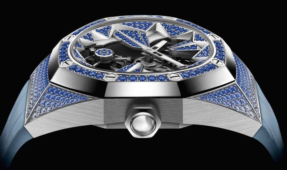 Женская новинка Concept представлена в корпусе диаметром 38.5 мм из белого золота 18к. Белые бриллианты и синие сапфиры украшают безель и ушки корпуса. Механизм виден с обеих сторон корпуса и включает в себя сатинированные мосты с белым лаком. Часы комплектуются новым Калибром 2951, который имеет клеть парящего турбийона на 6-ти часах. На циферблате с синими сапфирами отображаются часы и минуты. Часы комплектуются ремешком из кожи аллигатора с вставкой из белого золота 18к.