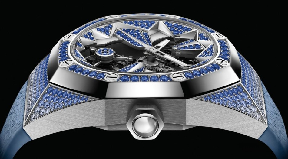 водонепроницаемость 20 м, корпус инкрустирован белыми бриллиантами и синими сапфирами