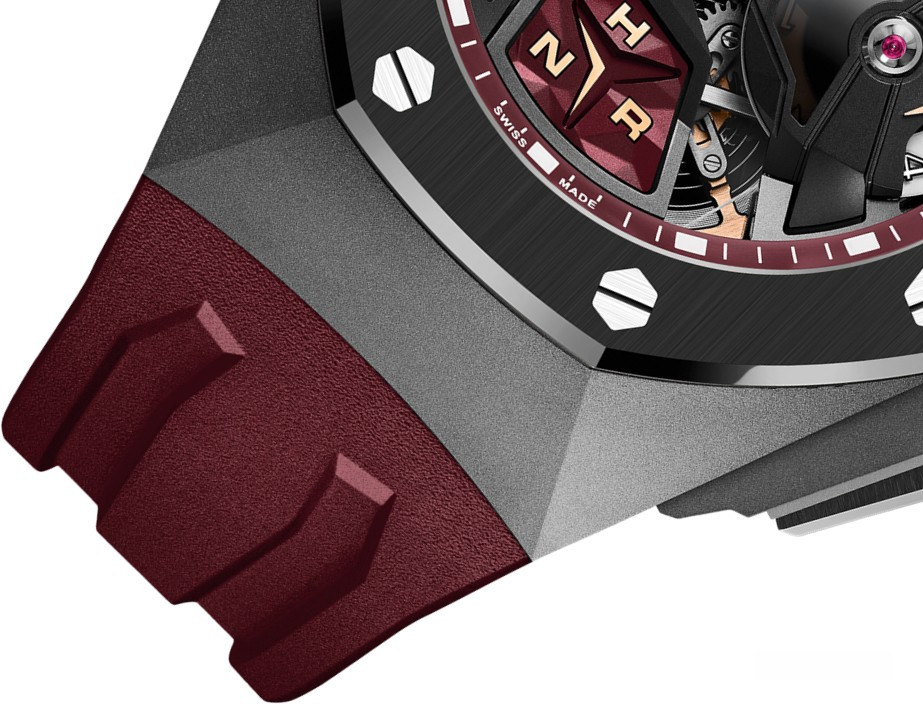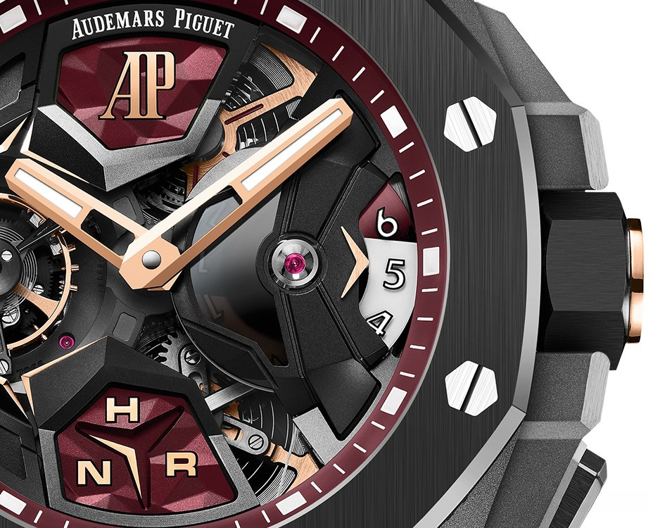 Audemars Piguet Royal Oak Concept Flying Tourbillon GMT представлены в корпусе из титана с керамическим безелем размером 44 х 16.1 мм и водонепроницаемостью до 100 метров. На бордовом скелетированном циферблате отображаются часы, минуты, 24-часовая индикация времени. Внутри корпуса установлен механизм с ручным заводом, Калибр 2954 с запасом хода 10 дней. Часы с турбийоном и GMT комплектуются каучуковым ремешком с титановой застежкой.