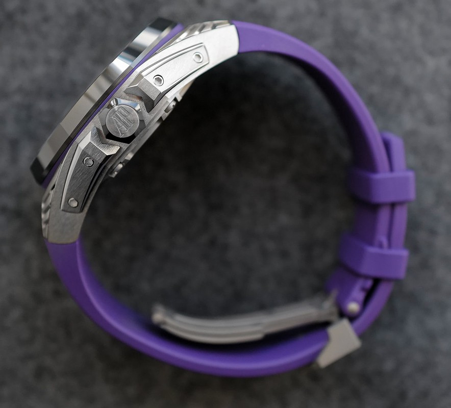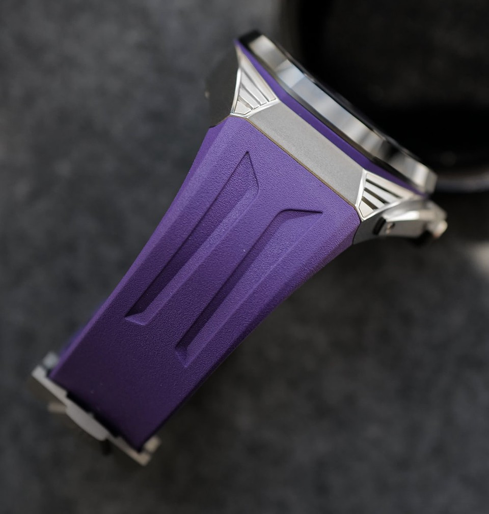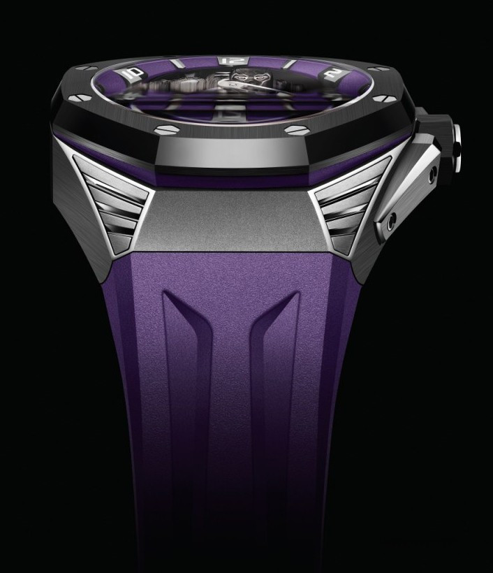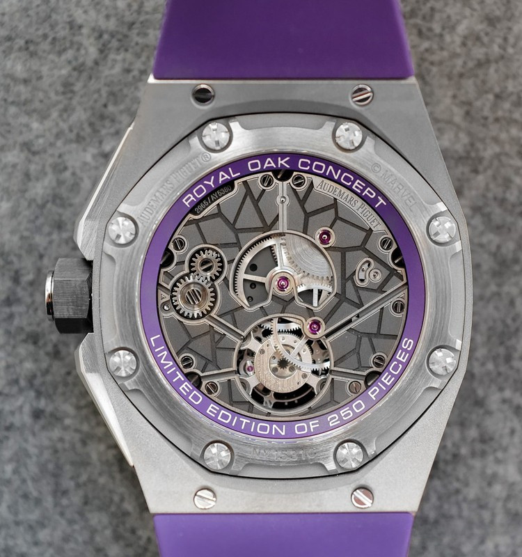 Часы Audemars Piguet Royal Oak Concept Marvel Black Panther Flying Tourbillon представлены в корпусе из титана и керамики размером 42 мм водонепроницаемостью 50 метров. Внутри корпуса находится механизм с ручным заводом, Калибр 2965, обладающий запасом хода 72 часа. На черном циферблате отображаются часы, минуты, секунды, турбийон. Часы поставляются на каучуковом ремешке с титановой вставкой. Серия ограничена - 250 шт.