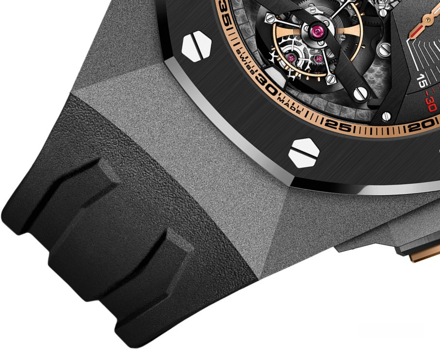 Часы Audemars Piguet Royal Oak Concept Minute Repeater Supersonnerie представлены в корпусе размером 44 х 16.5 мм из титана, керамики, розового золота 18к водонепроницаемостью 20 метров. Внутри корпуса установлен механизм с ручным заводом, Калибр 2937, обладающий запасом хода 48 часов. На черном циферблате отображаются часы, минуты. Часы поставляются на каучуковом ремешке с титановой застежкой.