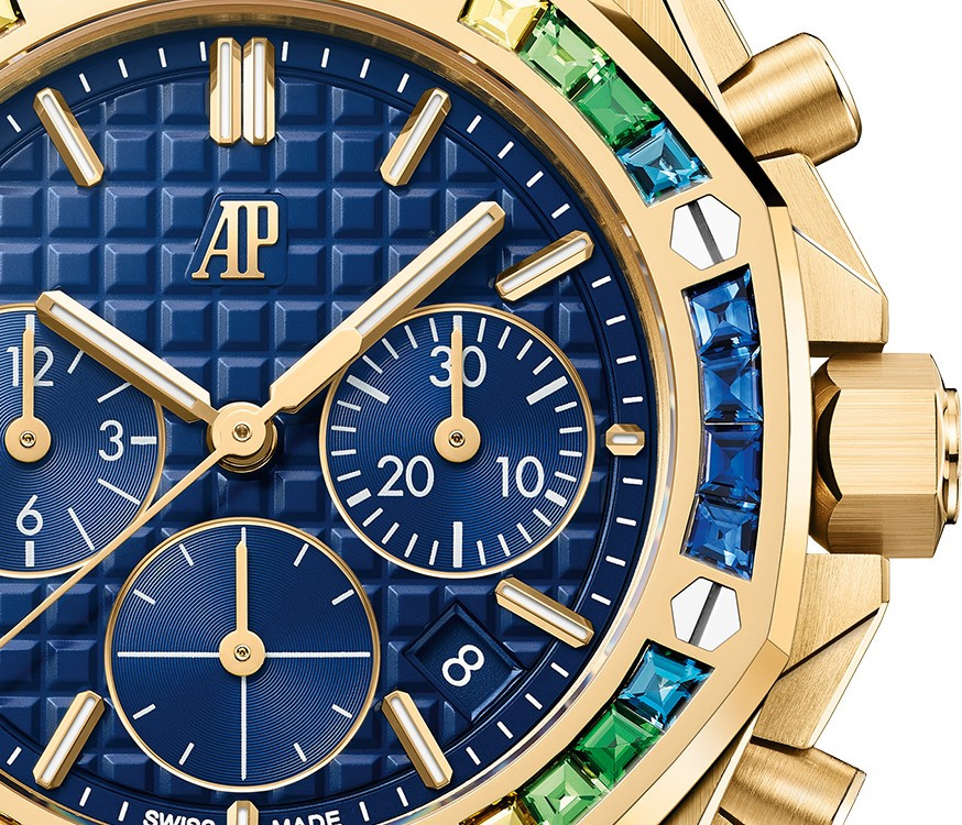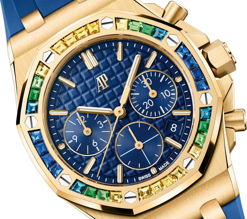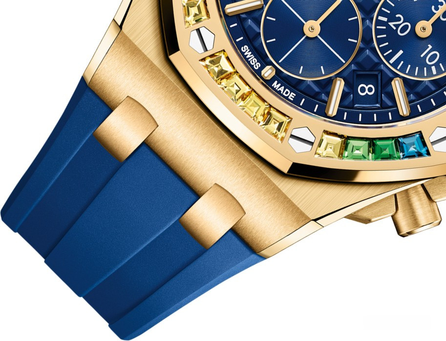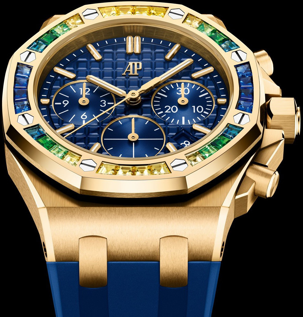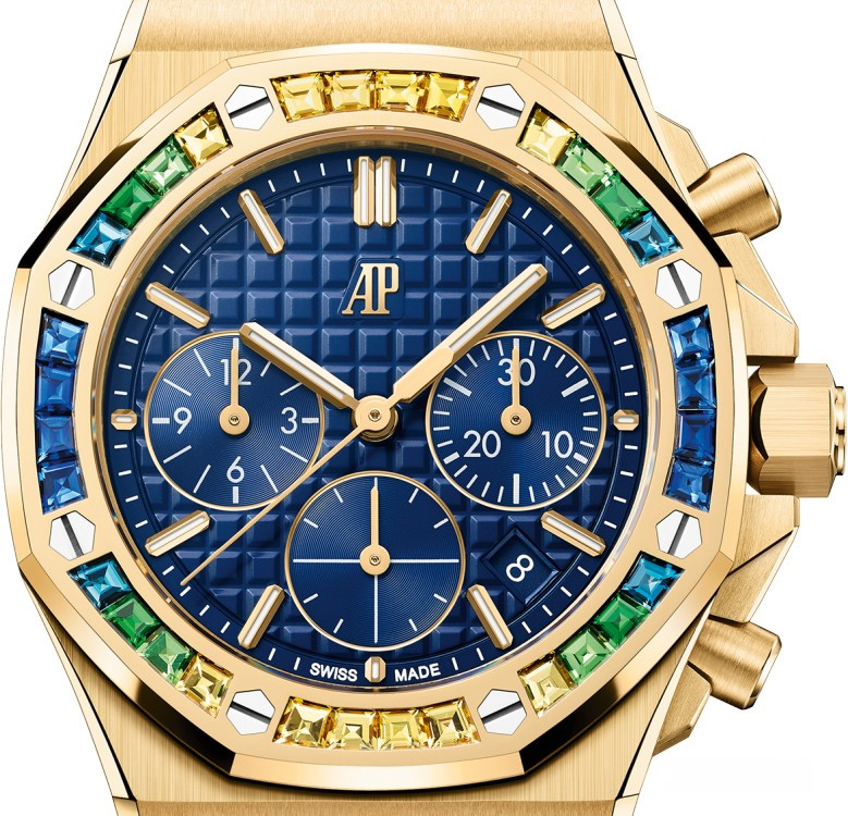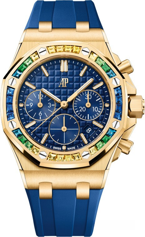 Часы Audemars Piguet Royal Oak Chronograph выпущены в корпусе из желтого золота 18к размером 37 х 12.4 мм и водонепроницаемостью 50 м. Внутри корпуса установлен автоматический механизм, Калибр 2385. На синем гильошированном циферблате отображаются часы, минуты, дата, секунды. Запас хода 40 часов. Часы комплектуются каучуковым ремешком с золотой застежкой. Безель из разноцветных драгоценных камней.