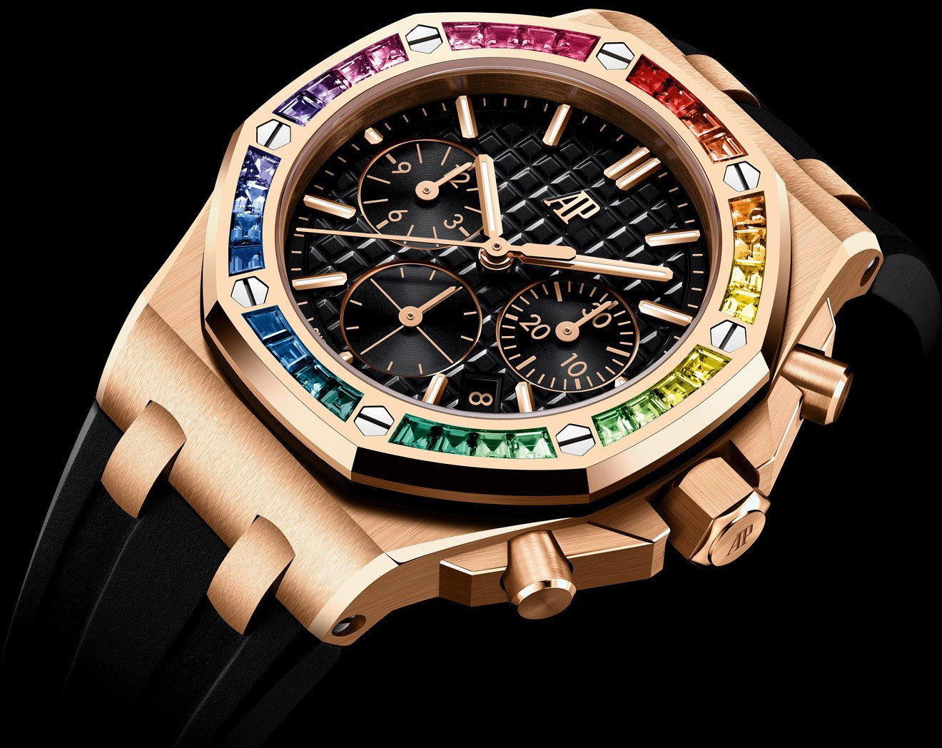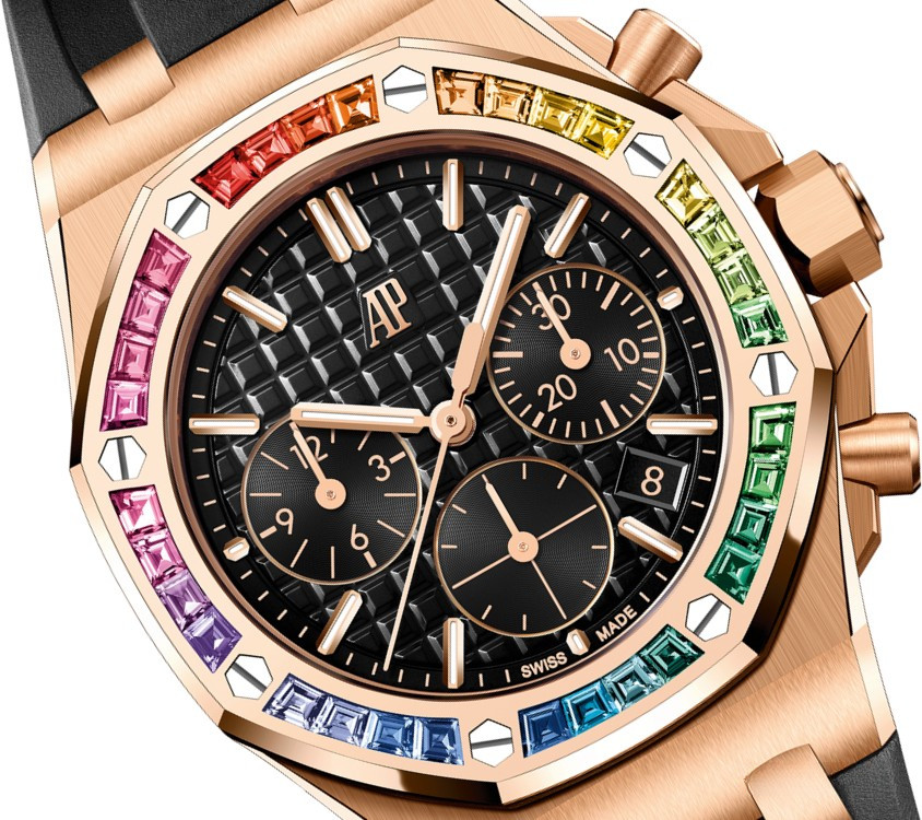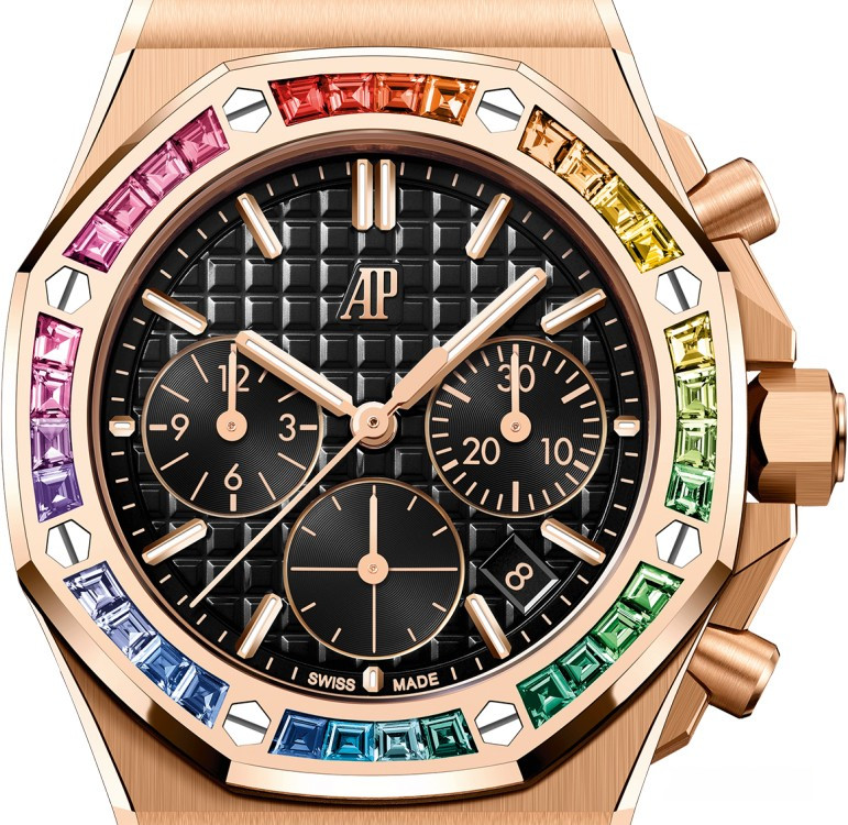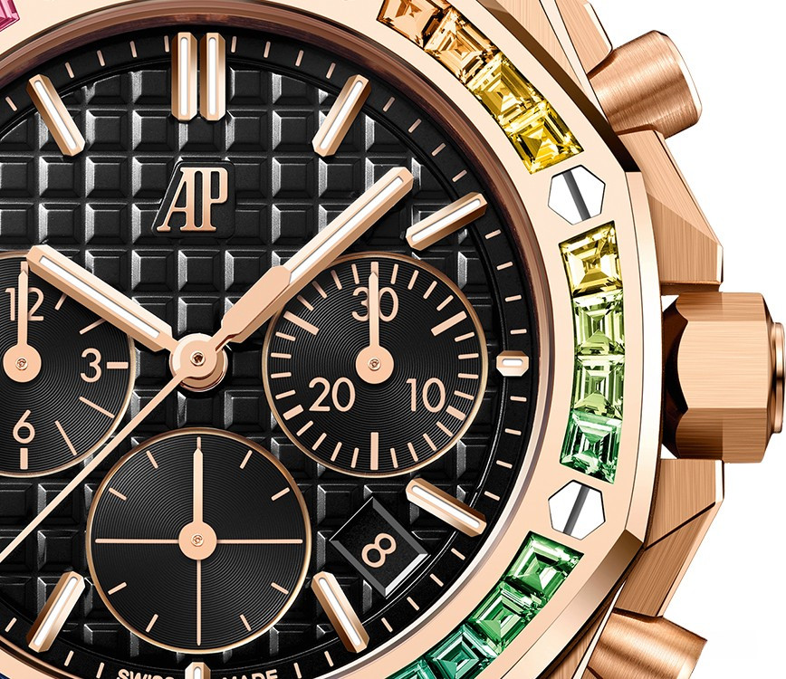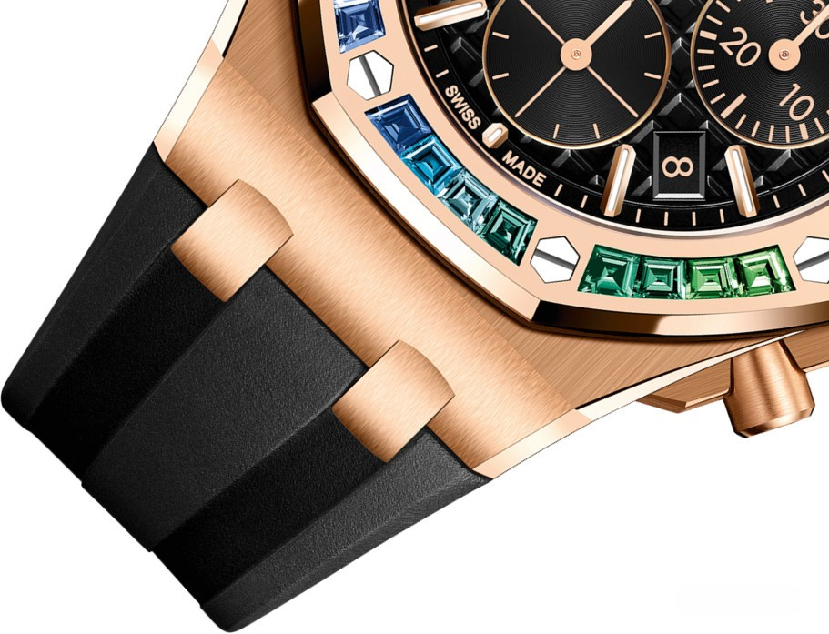 Часы Audemars Piguet Royal Oak Chronograph выпущены в корпусе из розового золота 18к размером 37 х 12.4 мм и водонепроницаемостью 50 м. Внутри корпуса установлен автоматический механизм, Калибр 2385. На черном гильошированном циферблате отображаются часы, минуты, дата, секунды. Запас хода 40 часов. Часы комплектуются каучуковым ремешком с золотой застежкой. Безель из разноцветных драгоценных камней.