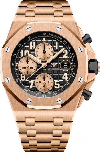 Часы Audemars Piguet Royal Oak Offshore Chronograph 42mm выпущены в корпусе из розового золота 18к размером 42 х 14.6 мм и водонепроницаемостью 100 м. Внутри корпуса установлен автоматический механизм, Калибр 3126/3840, обладающий запасом хода 50 часов. На черном 'Mega Tapisserie' с золотистым циферблате отображаются часы, минуты, секунды, дата, накопители хронографа. Запас хода 50 часов. Часы комплектуются браслетом из розового золота 18к.