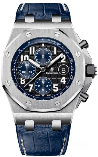 Часы Audemars Piguet Royal Oak Offshore Chronograph 42mm 26470ST.OO.A028CR.01 выпущены в корпусе из нержавеющей стали, размером 42 х 14,55 мм и водонепроницаемостью 100 м. Внутри корпуса установлен автоматический механизм, Калибр АР 3126/3840. На черным с синим 'Mega Tapisserie' циферблате отображаются часы, минуты, секунды, дата, тахиметр. Запас хода 50 часов. Часы комплектуются ремешком из кожи аллигатора с вставкой из нержавеющей стали.