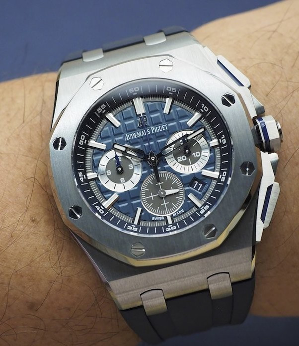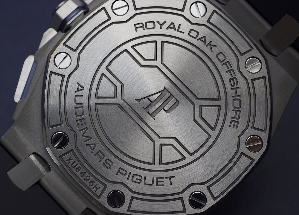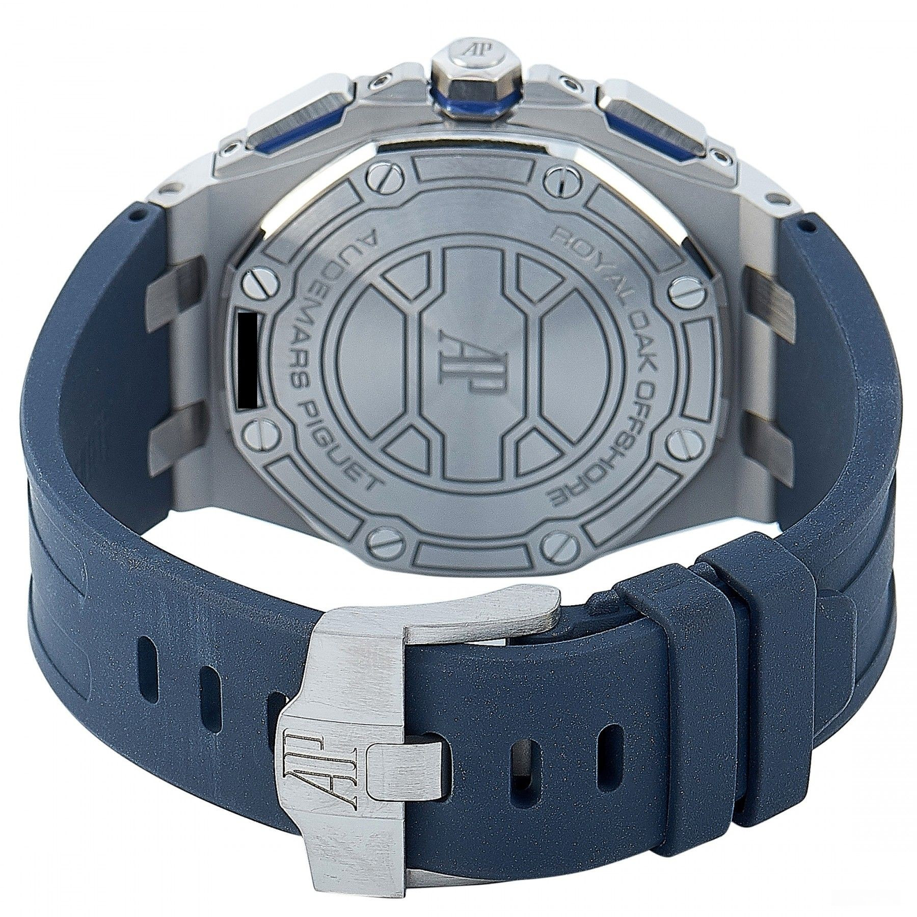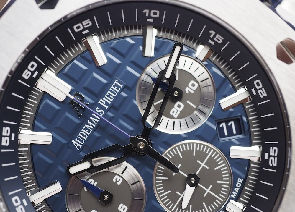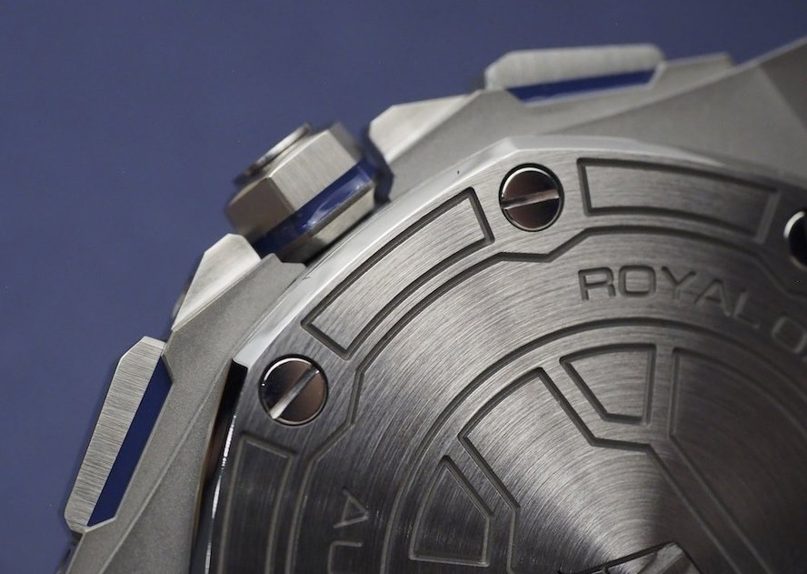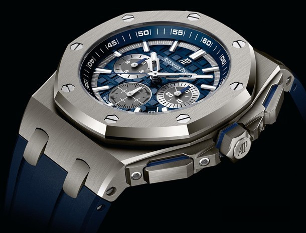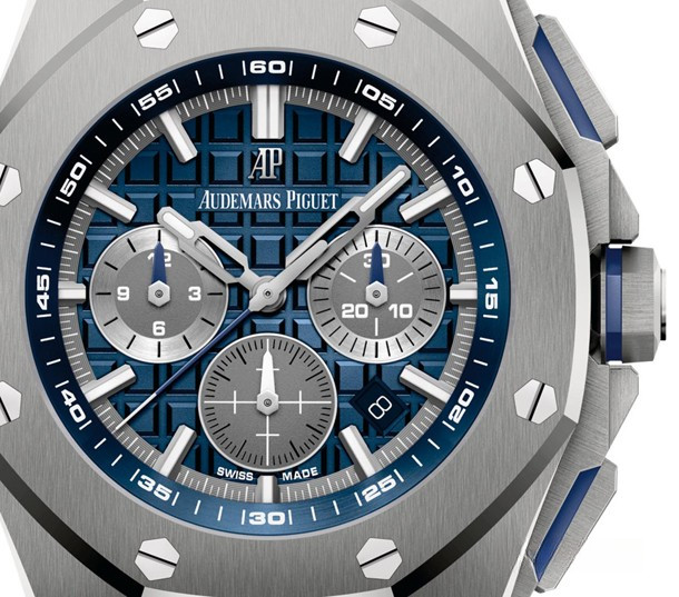 Часы Audemars Piguet Royal Oak Offshore Chronograph 42mm выпущены в корпусе из титана, размером 42 х 12.8 мм и водонепроницаемостью 100 м. Внутри корпуса установлен автоматический механизм, Калибр АР 2385. На синем 'Mega Tapisserie' циферблате отображаются часы, минуты, секунды, дата. Запас хода 40 часов. Часы комплектуются каучуковым ремешком с титановой вставкой.