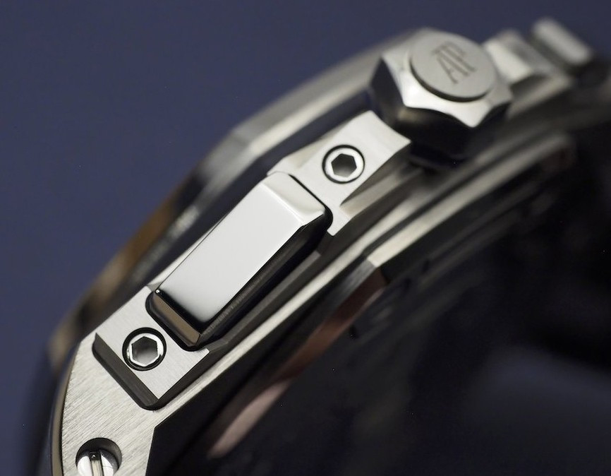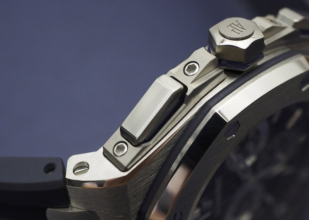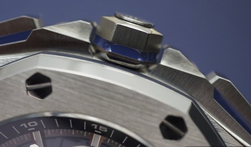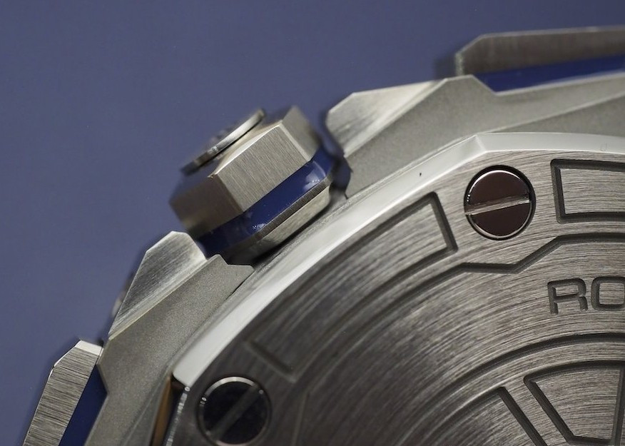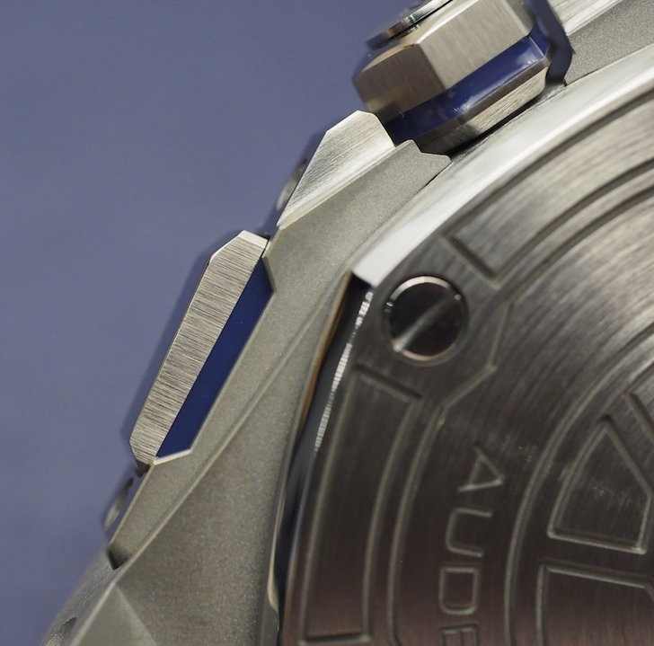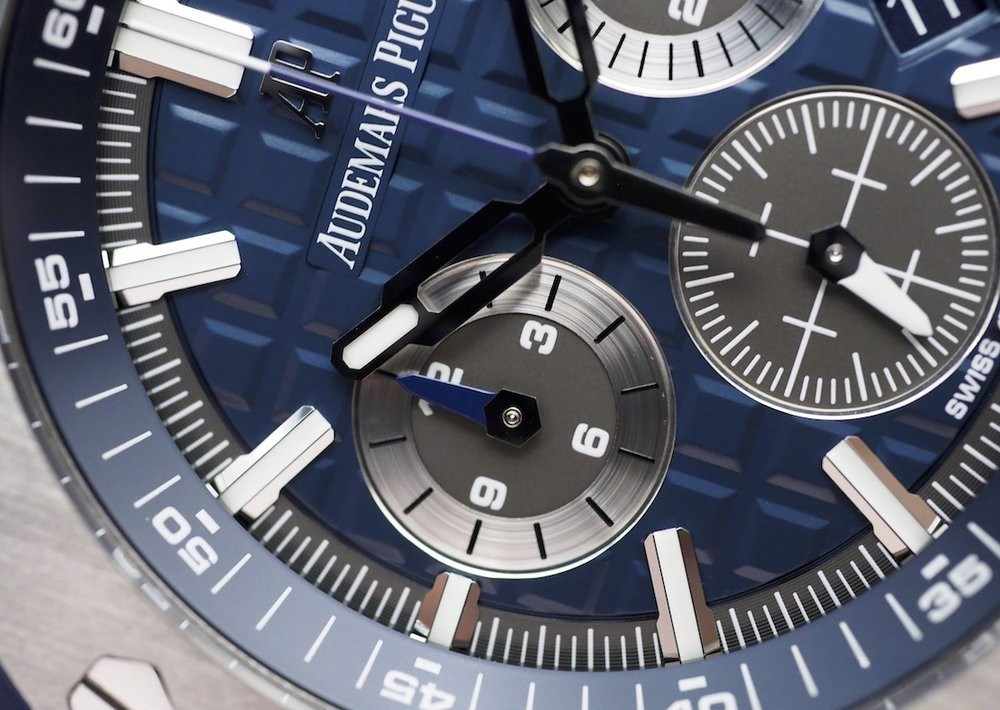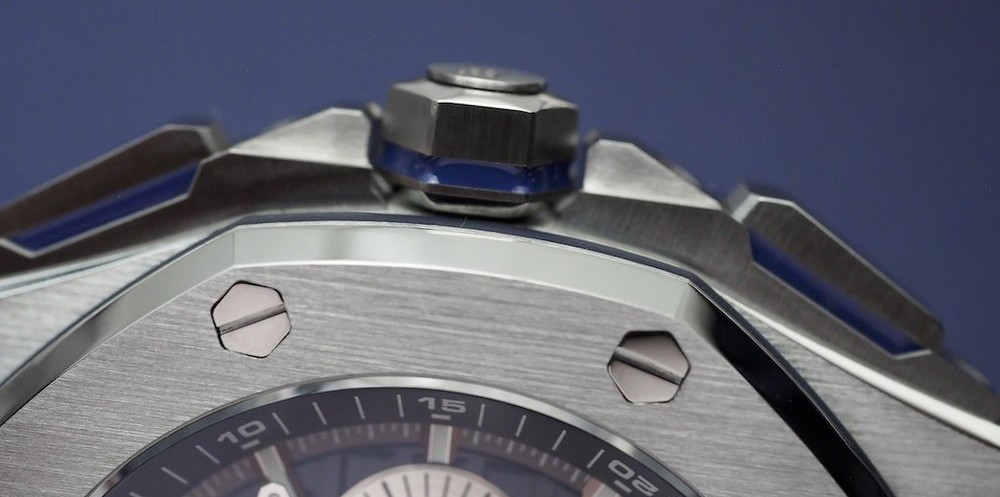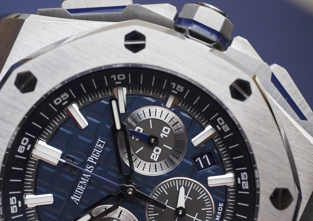 Часы Audemars Piguet Royal Oak Offshore Chronograph 42mm выпущены в корпусе из титана, размером 42 х 12.8 мм и водонепроницаемостью 100 м. Внутри корпуса установлен автоматический механизм, Калибр АР 2385. На синем 'Mega Tapisserie' циферблате отображаются часы, минуты, секунды, дата. Запас хода 40 часов. Часы комплектуются каучуковым ремешком с титановой вставкой.