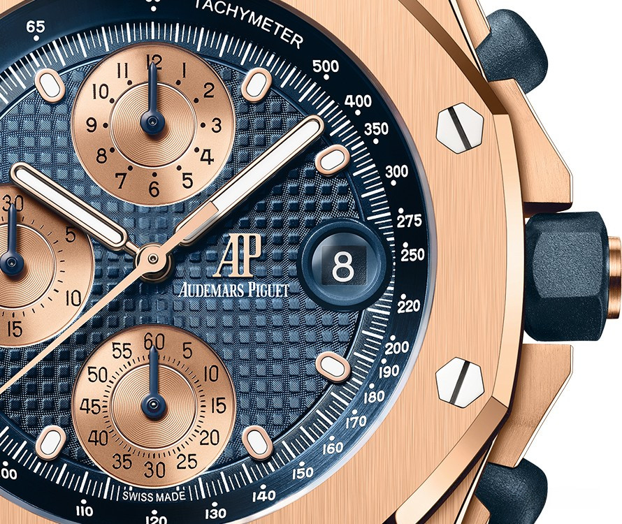 Часы Audemars Piguet Royal Oak Offshore Chronograph 42mm выпущены в корпусе из розового золота 18к размером 42 х 15.2 мм и водонепроницаемостью 100 м. Внутри корпуса установлен автоматический механизм, Калибр 4404, обладающий запасом хода 70 часов. На синем 'Mega Tapisserie' с золотистым циферблате отображаются часы, минуты, секунды, дата, накопители хронографа, тахиметр. Часы комплектуются браслетом из розового золота 18к.