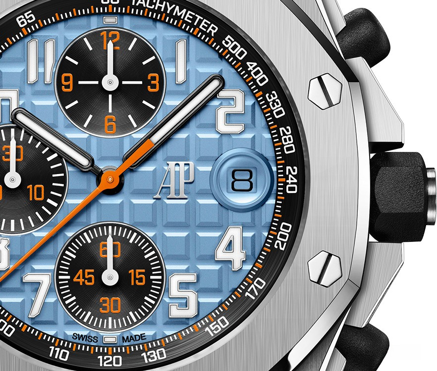 Часы Audemars Piguet Royal Oak Offshore Chronograph 42mm выпущены в корпусе из нержавеющей стали размером 42 х 15.2 мм и водонепроницаемостью 100 м. Внутри корпуса установлен автоматический механизм, Калибр 4404, обладающий запасом хода 70 часов. На голубом 'Mega Tapisserie' циферблате отображаются часы, минуты, секунды, дата, накопители хронографа, тахиметр. Часы комплектуются каучуковым ремешом с вставкой из нержавеющей стали.