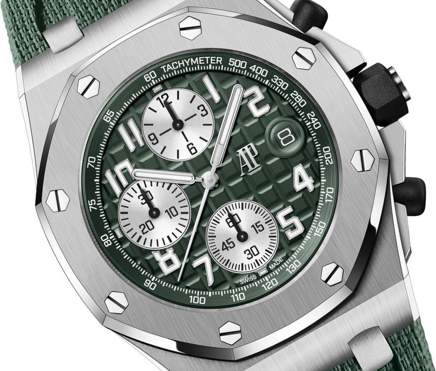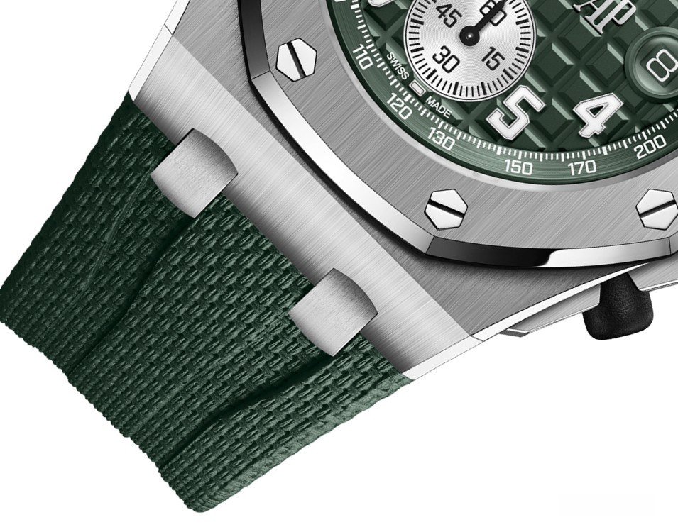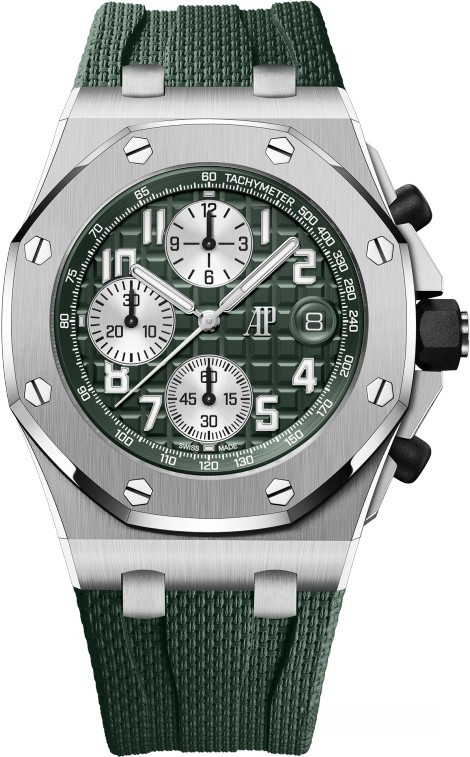 Часы Audemars Piguet Royal Oak Offshore Chronograph 42mm выпущены в корпусе из титана размером 42 х 15.2 мм и водонепроницаемостью 100 м. Внутри корпуса установлен автоматический механизм, Калибр 4404, обладающий запасом хода 70 часов. На зеленом 'Mega Tapisserie' циферблате отображаются часы, минуты, секунды, дата, накопители хронографа, тахиметр. Часы комплектуются каучуковым ремешом с вставкой из титана.