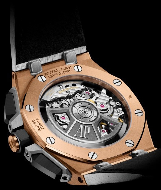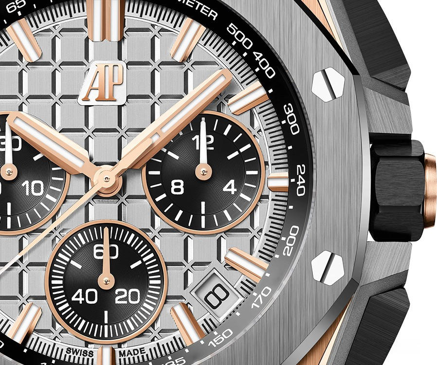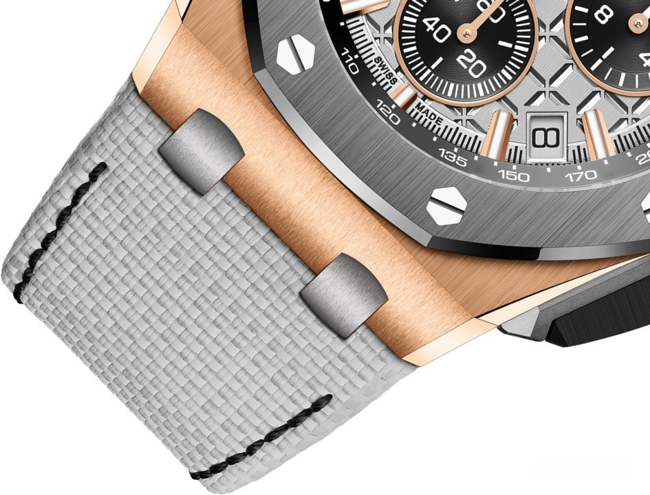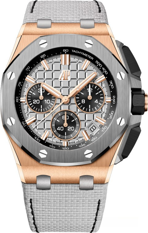 Часы Audemars Piguet Royal Oak Offshore Chronograph 43 mm представлены в корпусе из розового золота 18к и титана размером 43 х 14.4 мм и водонепроницаемостью 100 м. Внутри корпуса установлен автоматический механизм, Калибр 4401, обладающий запасом хода 70 часов. На серебристом с черным гильошированном циферблате отображаются часы, минуты, секунды, дата, тахиметр. Часы комплектуются кожаным ремешком с титановой застежкой.