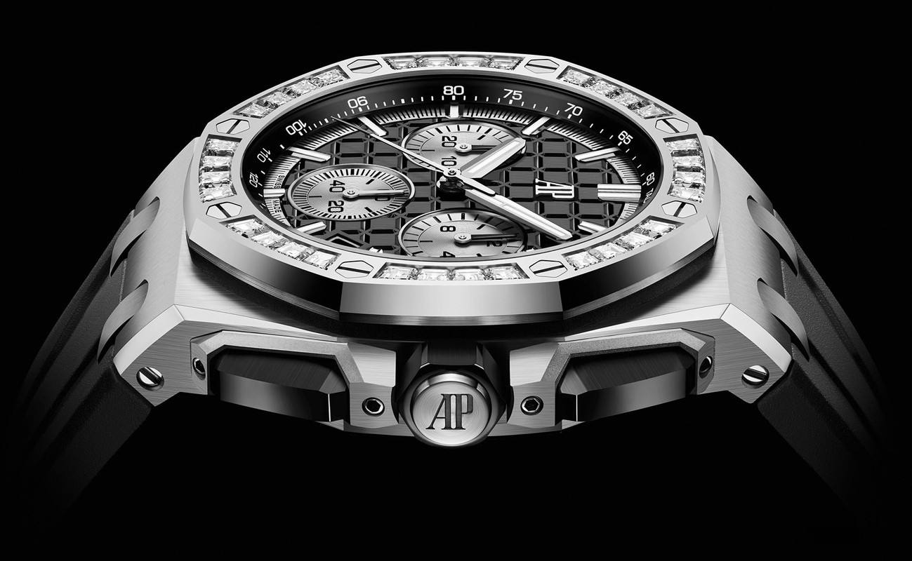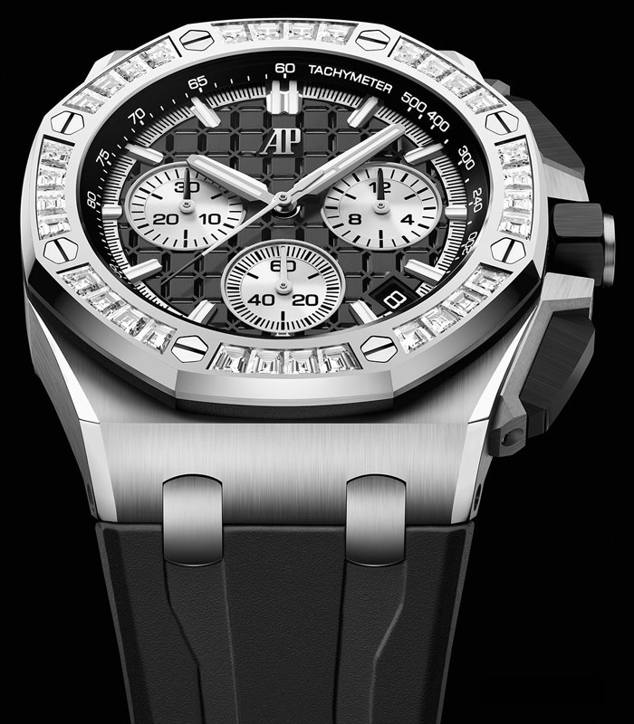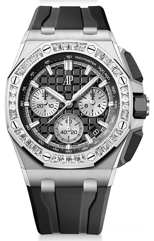 Часы Audemars Piguet Royal Oak Offshore Chronograph 43 mm 2022 представлены в корпусе размером 43 х 14.4 мм из белого золота 18к водонепроницаемостью 20 метров. Внутри корпуса установлен автоматический механизм, Калиб 4401, обладающий запасом хода 70 часов. На черном гильошированном циферблате отображаются часы, минуты, дата, секунды, тахиметр, накопители хронографа. Часы поставляются с каучуковым ремешком. Безель из белых багетных бриллиантов.