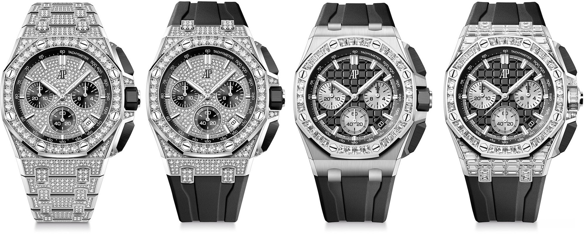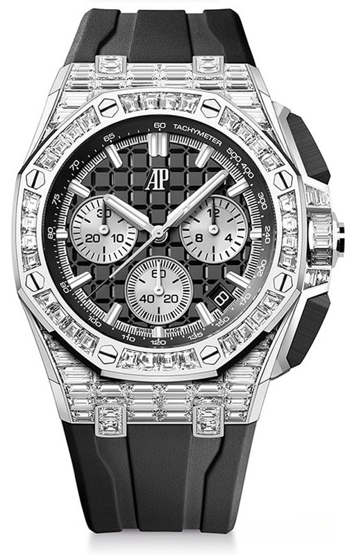 Часы Audemars Piguet Royal Oak Offshore Chronograph 43 mm 2022 представлены в корпусе размером 43 х 14.4 мм из белого золота 18к водонепроницаемостью 20 метров. Внутри корпуса установлен автоматический механизм, Калиб 4401, обладающий запасом хода 70 часов. На черном гильошированном циферблате отображаются часы, минуты, дата, секунды, тахиметр, накопители хронографа. Часы поставляются с каучуковым ремешком. Корпус инкрустирован белыми багетными бриллиантами.