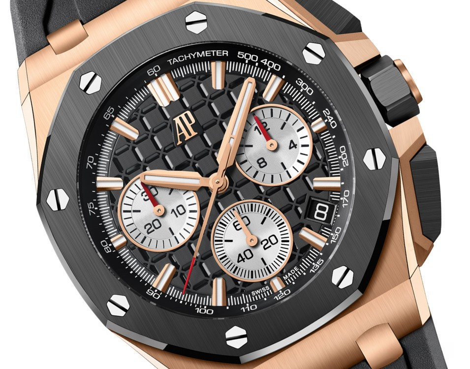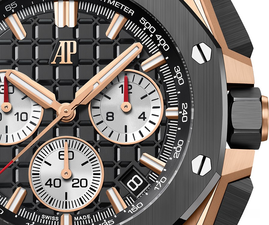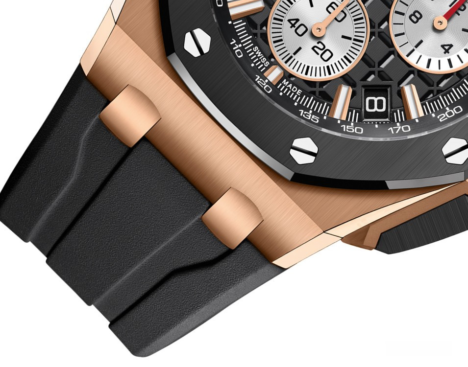 Часы Audemars Piguet Royal Oak Offshore Chronograph 43 mm представлены в корпусе из розового золота 18к и керамики размером 43 х 14.4 мм и водонепроницаемостью 100 м. Внутри корпуса установлен автоматический механизм, Калибр 4401, обладающий запасом хода 70 часов. На черном с серебристым гильошированном циферблате отображаются часы, минуты, секунды, дата, тахиметр. Часы комплектуются каучуковым ремешком с вставкой из розового золота 18к.