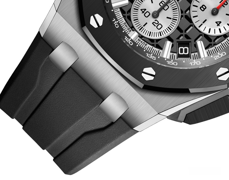 Часы Audemars Piguet Royal Oak Offshore Chronograph 43 mm представлены в корпусе из нержавеющей стали и керамики размером 43 х 14.4 мм и водонепроницаемостью 100 м. Внутри корпуса установлен автоматический механизм, Калибр 4401, обладающий запасом хода 70 часов. На сером с серебристым гильошированном циферблате отображаются часы, минуты, секунды, дата, тахиметр. Часы комплектуются каучуковым ремешком с вставкой из нержавеющей стали.