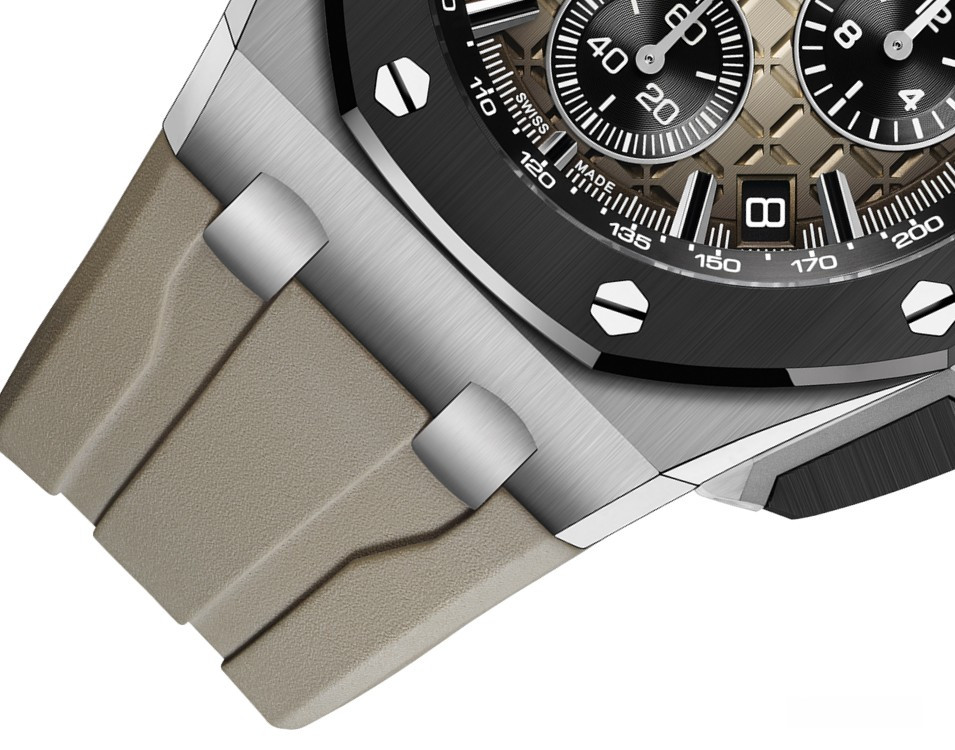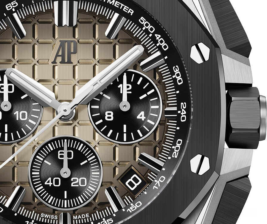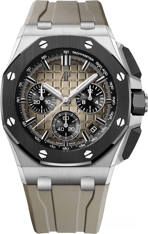 Часы Audemars Piguet Royal Oak Offshore Chronograph 43 mm представлены в корпусе из нержавеющей стали и керамики размером 43 х 14.4 мм и водонепроницаемостью 100 м. Внутри корпуса установлен автоматический механизм, Калибр 4401, обладающий запасом хода 70 часов. На коричневом с черным гильошированном циферблате отображаются часы, минуты, секунды, дата, тахиметр. Часы комплектуются каучуковым ремешком с вставкой из нержавеющей стали.