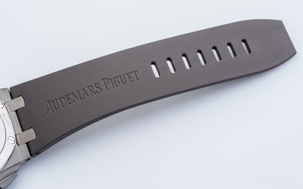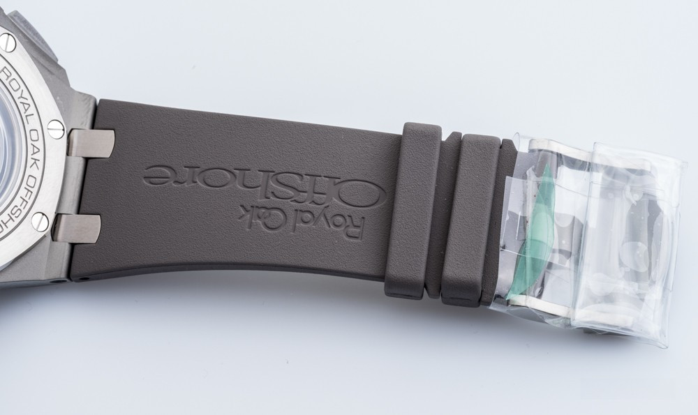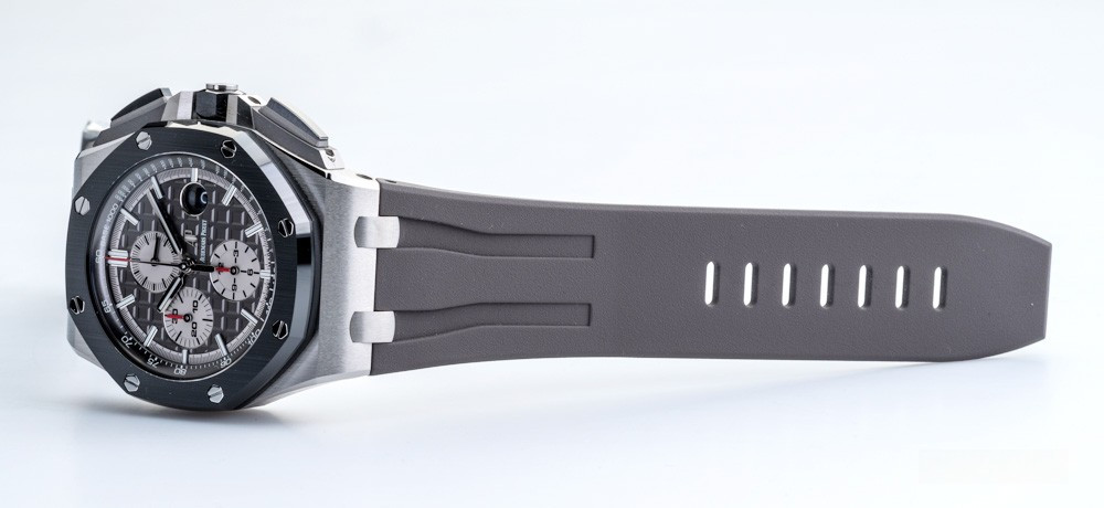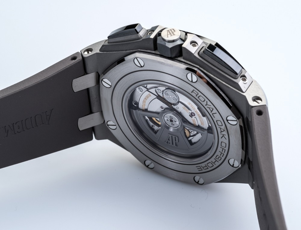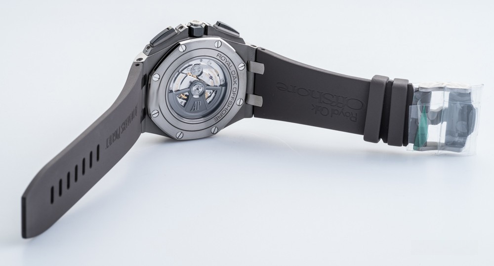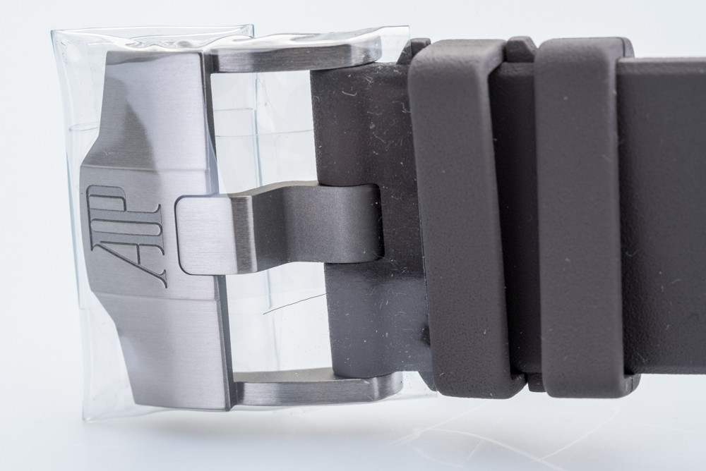 Часы Audemars Piguet Royal Oak Offshore Chronograph 44 mm 26400IO.OO.A004CA.01 с функцией хронографа выпущены в корпусе из титана, размером 44 х 14,43 мм и водонепроницаемостью 100 м. Внутри корпуса установлен автоматический механизм, Калибр АР 3126/3840. На сером с гильоше 'Mega Tapisserie' циферблате отображаются часы, минуты, секунды, дата, тахиметр. Запас хода составляет 50 часов. Часы комплектуются каучуковым ремешком с титановой вставкой.