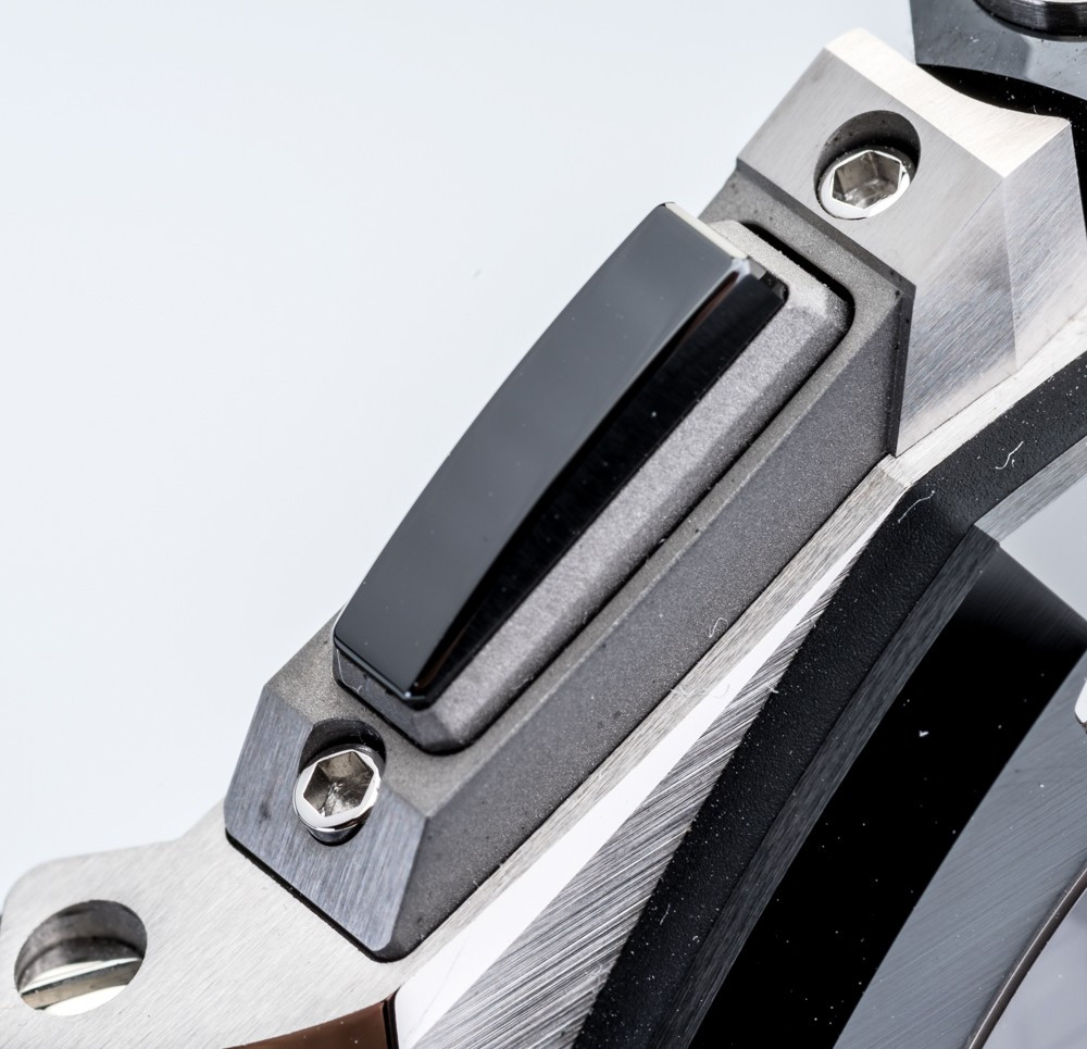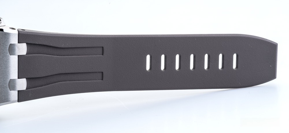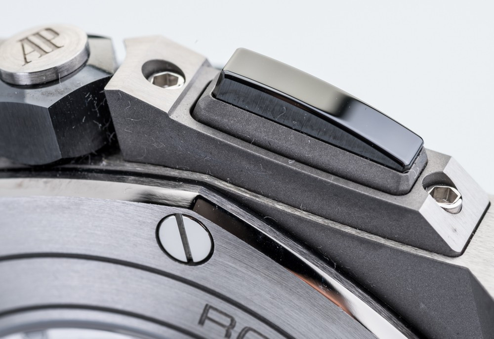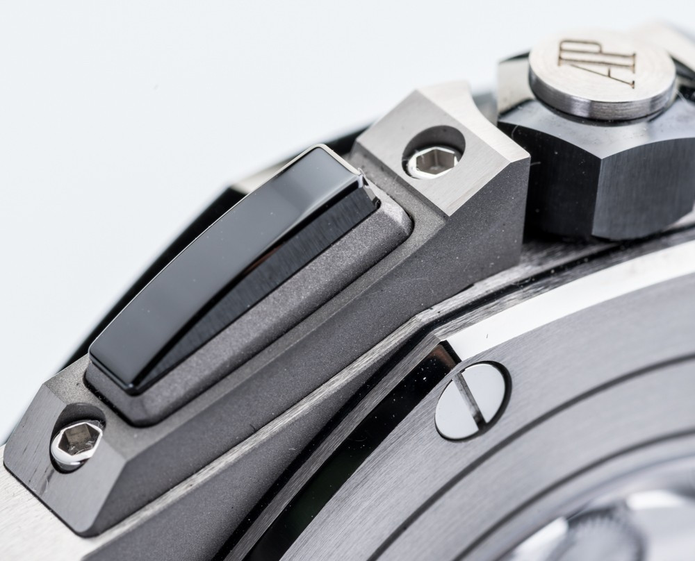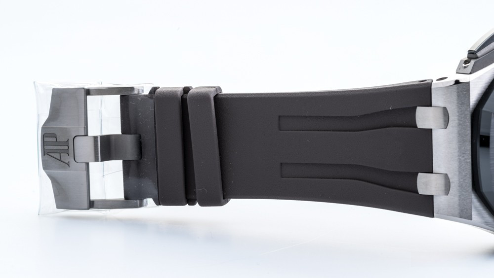Часы Audemars Piguet Royal Oak Offshore Chronograph 44 mm 26400IO.OO.A004CA.01 с функцией хронографа выпущены в корпусе из титана, размером 44 х 14,43 мм и водонепроницаемостью 100 м. Внутри корпуса установлен автоматический механизм, Калибр АР 3126/3840. На сером с гильоше 'Mega Tapisserie' циферблате отображаются часы, минуты, секунды, дата, тахиметр. Запас хода составляет 50 часов. Часы комплектуются каучуковым ремешком с титановой вставкой.