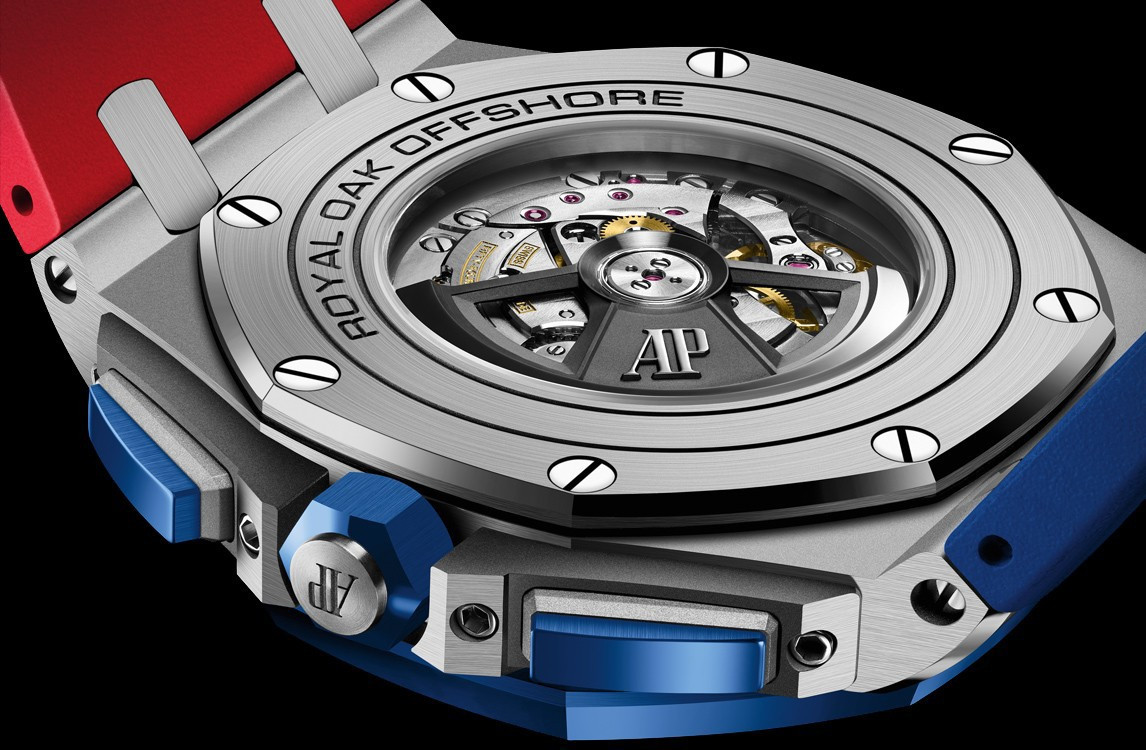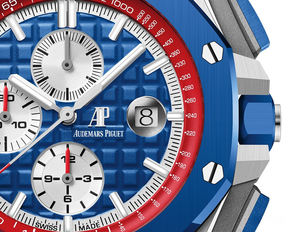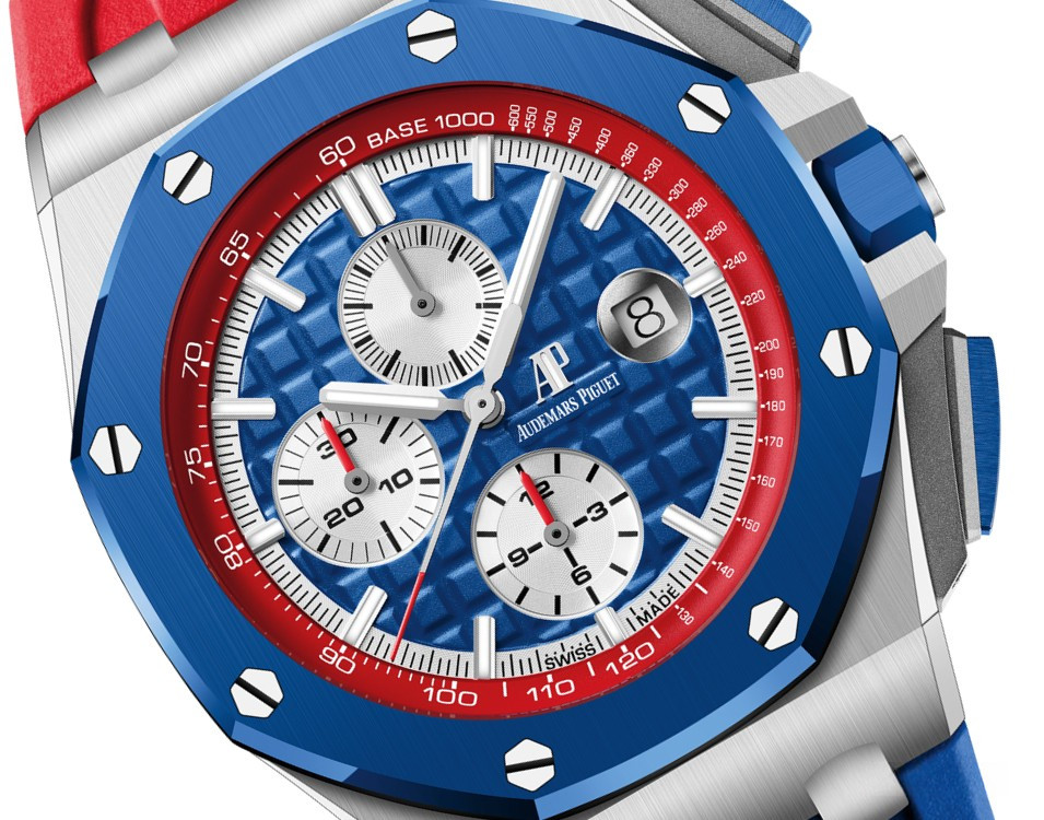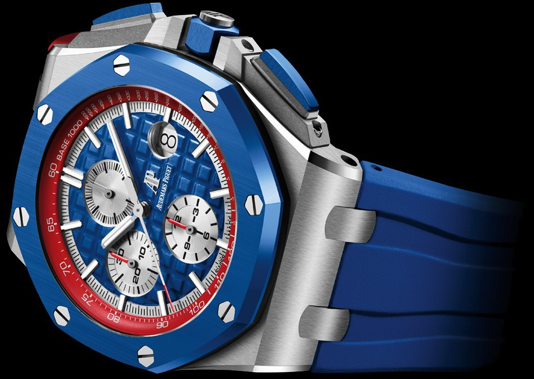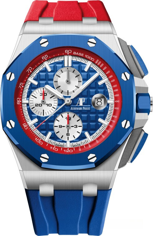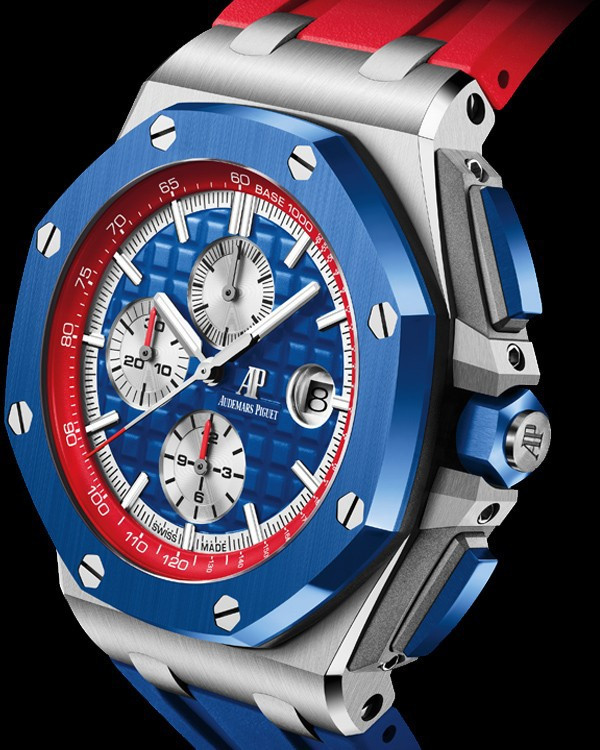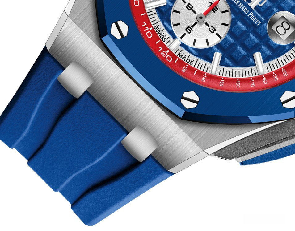 Часы Audemars Piguet Royal Oak Offshore Chronograph 44 mm с функцией хронографа выпущены в корпусе из нержавеющей стали и керамики, размером 44 х 14.4 мм и водонепроницаемостью 100 м. Внутри корпуса установлен автоматический механизм, Калибр АР 3126/3840. На синем 'Mega Tapisserie' циферблате отображаются часы, минуты, секунды, дата, тахиметр. Запас хода составляет 50 часов. Часы комплектуются каучуковым ремешком с вставкой из нержавеющей стали.