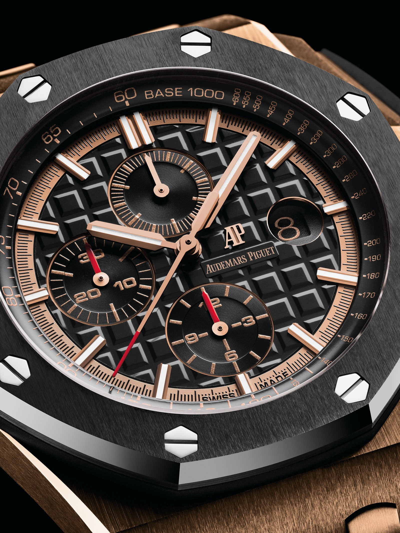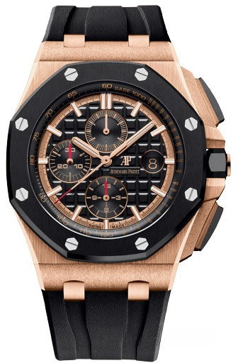 Часы Audemars Piguet Royal Oak Offshore Chronograph 44 mm 26401RO.OO.A002CA.02 с функцией хронографа выпущены в корпусе из розового золота 18к и керамики, размером 44 х 14,4 мм и водонепроницаемостью 100 м. Внутри корпуса установлен автоматический механизм, Калибр АР 3126/3840. На черном с гильоше 'Mega Tapisserie' циферблате отображаются часы, минуты, секунды, дата, тахиметр. Запас хода составляет 50 часов. Часы комплектуются каучуковым ремешком с вставкой из розового золота 18к.