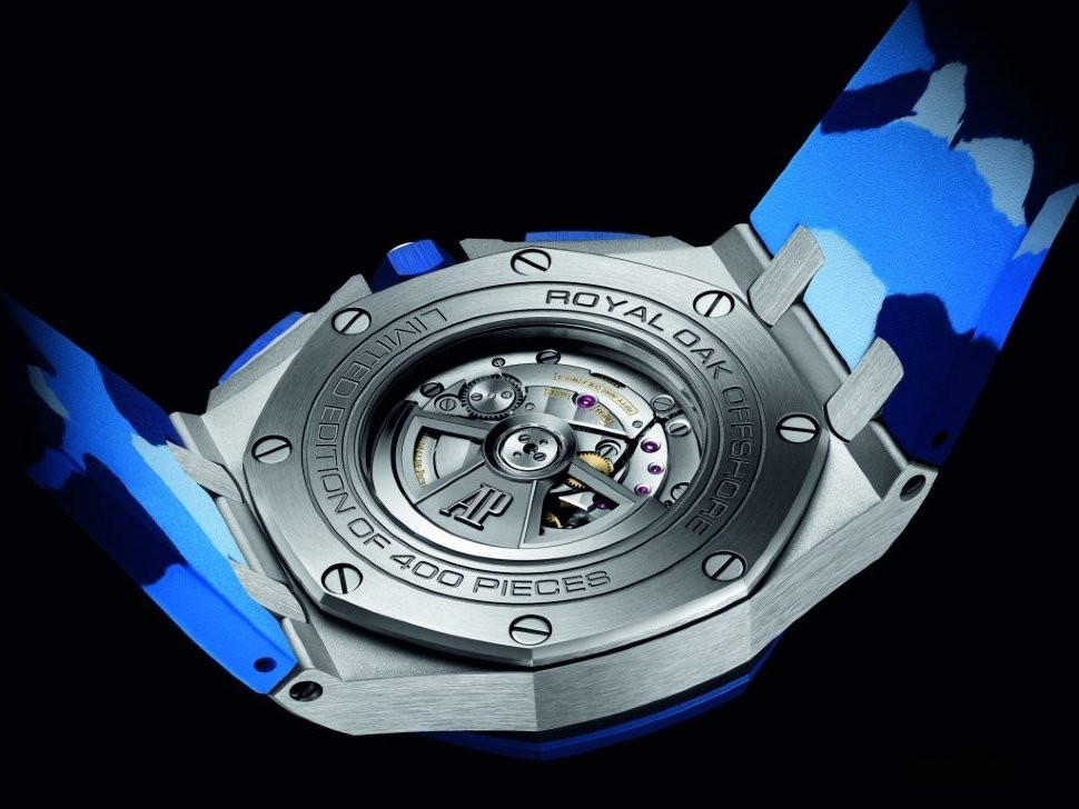 Часы Audemars Piguet Royal Oak Offshore Chronograph Camouflage представлены в корпусе из нержавеющей стали с керамическим безелем размером 44 мм. Внутри корпуса установлен автоматический механизм, Калибр 3126/3840, обладающий запасом хода 50 часов. На синем с белым циферблате Mega Tapisserie отображаются часы, минуты, секунды, дата, тахиметр, накопители хронографа. Часы поставляются на каучуковом ремешке с вставкой из нержавеющей стали. Водонепроницаемость корпуса составляет 100 метров.
