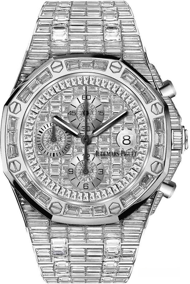 Часы Audemars Piguet Royal Oak Offshore Chronograph Gold Jeweled 26473BC.ZZ.8043BC.01 выпущены из белого золота 18к, размером 42 х 15.4 мм. Часы обладают водонепроницаемостью до 20 м. Корпус инкрустированным белыми багетными бриллиантами. Внутри корпуса установлен автоматический механизм, Калибр АР 3126/3840. На циферблате из белых багетных бриллиантов отображаются часы, минуты, секунды и дата. Запас хода составляет 50 часов. Часы комплектуются браслетом из белого золота 18к, инкрустированным белыми багетными бриллиантами.