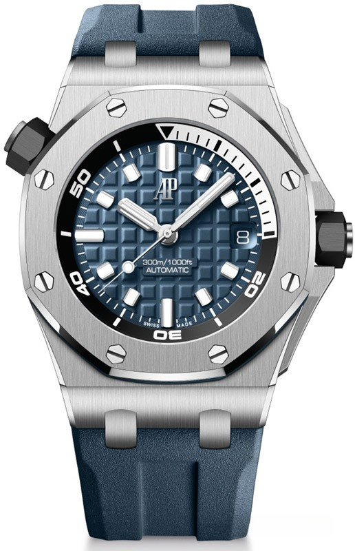 Часы Audemars Piguet Royal Oak Offshore Diver выпущены из нержавеющей стали размером 42 х 14.2 мм и водонепроницаемостью до 300 м. Внутри корпуса установлен автоматический механизм, Калибр АР 4308. На синем гильошированном 'Mega Tapisserie' циферблате отображаются часы, минуты, секунды, дата. Запас хода 60 часов. Часы комплектуются каучуковым ремешком с вставкой из нержавеющей стали. Сапфировое стекло покрывает лицевую сторону корпуса и его заднюю крышку. Вращающийся безель со шкалой обратного отсчета времени.