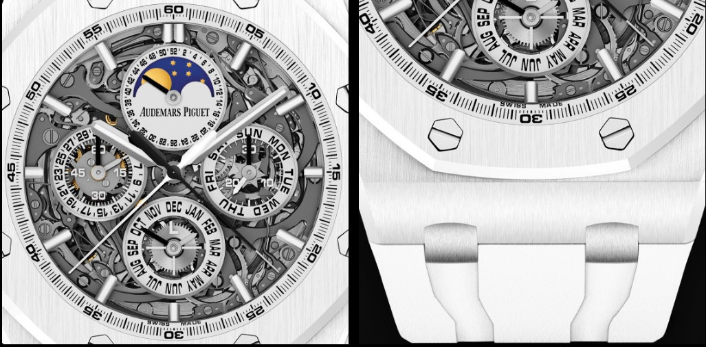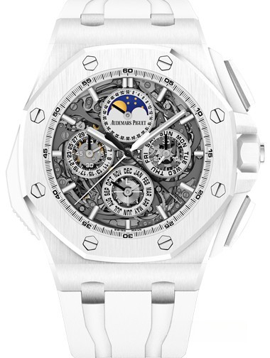 Часы Audemars Piguet Royal Oak Offshore Grande Complication 26582CB.OO.A010CA.01 выпущены из керамики размером 44 х 15.4 мм и водонепроницаемостью 20 м со сплит-хронографом и репетиром. Внутри корпуса установлен автоматический механизм, Калибр 2885. На сером скелетированном циферблате отображаются часы, минуты, секунды, дата, день недели, месяц, фаза луны. Запас хода 45 часов. Часы комплектуются каучуковым ремешком с вставкой из титана.
