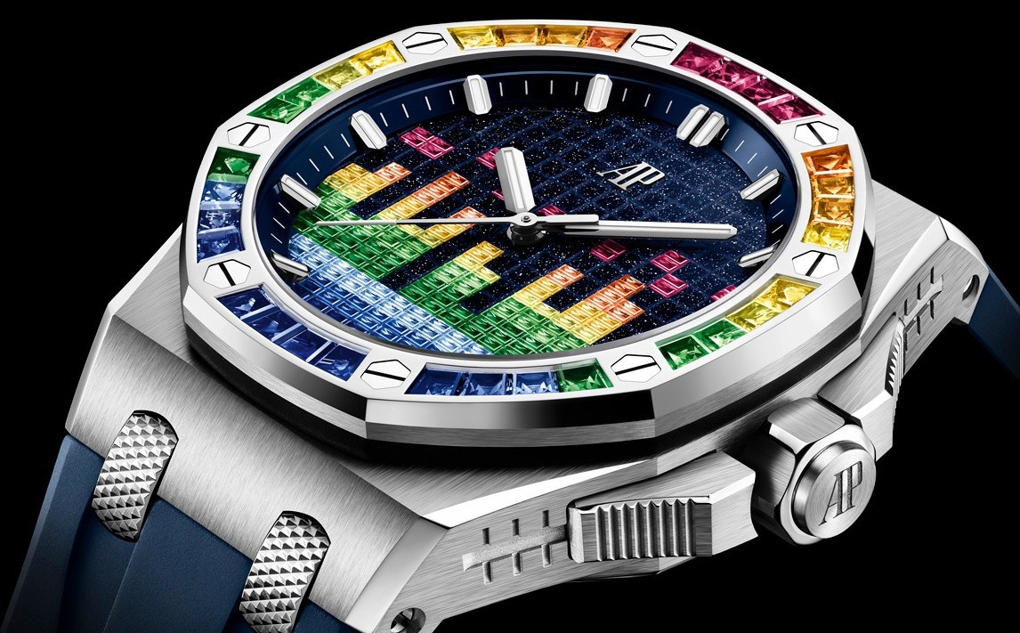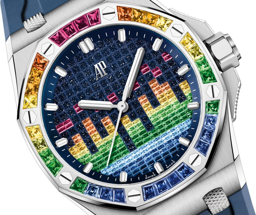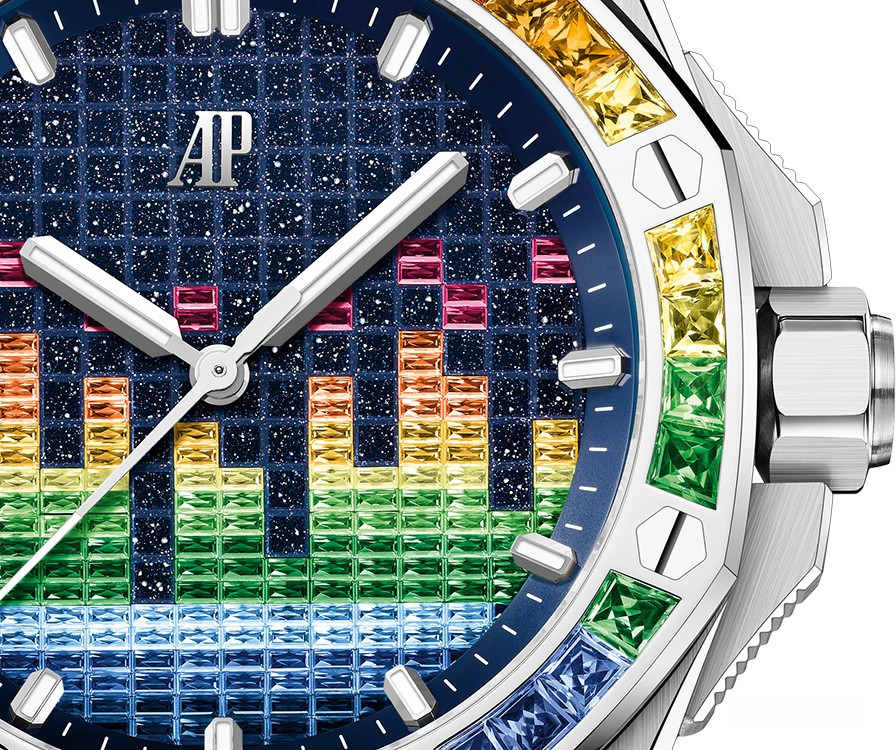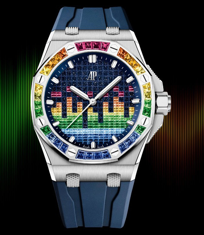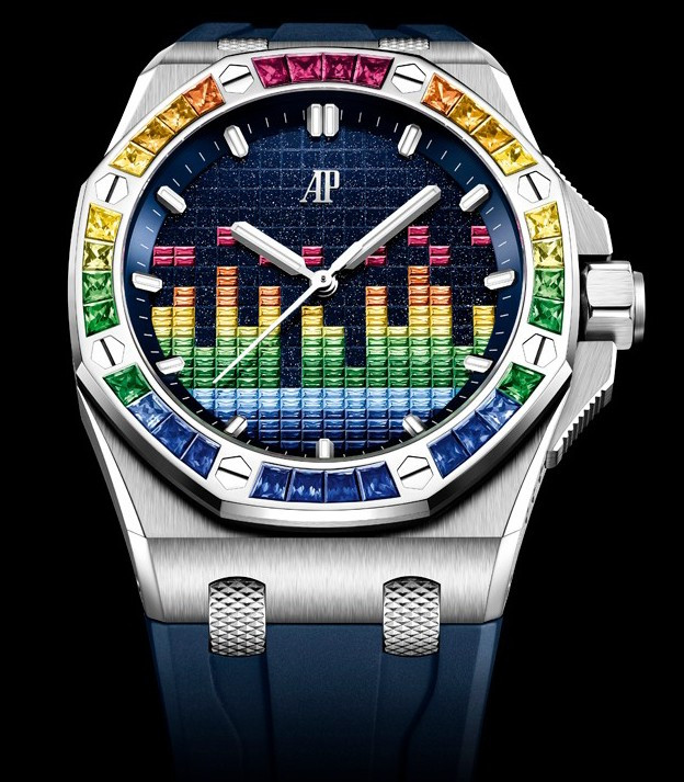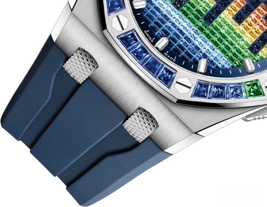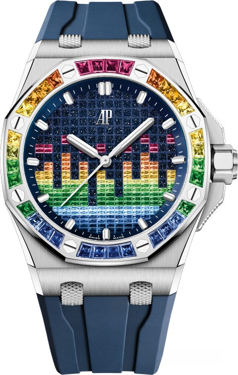 Часы Audemars Piguet Royal Oak Offshore Selfwinding Music 43 mm представлены в корпусе из белого золота 18к размером 43 х 14.4 мм водонепроницаемостью 100 метров. Внутри корпуса установлен автоматический механизм, Калибр 4309, обладающий запасом хода 70 часов. На синем гильошированном циферблате с разноцветными багетными драгоценными камнями отображаются часы, минуты, секунды. Часы комплектуются каучуковым ремешком с золотой застежкой. Безель из разноцветных багетных сапфиров.
