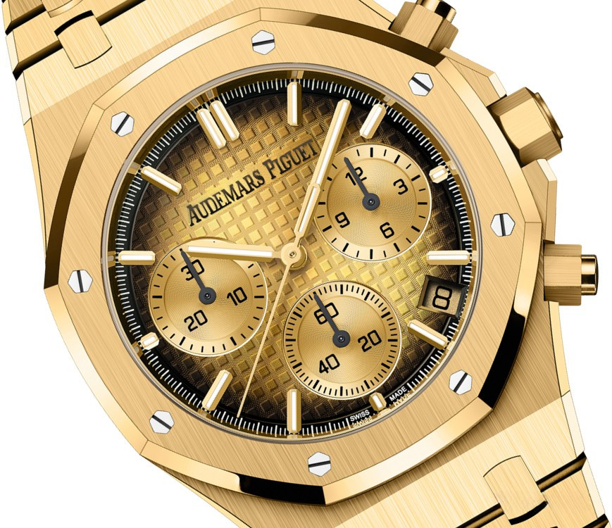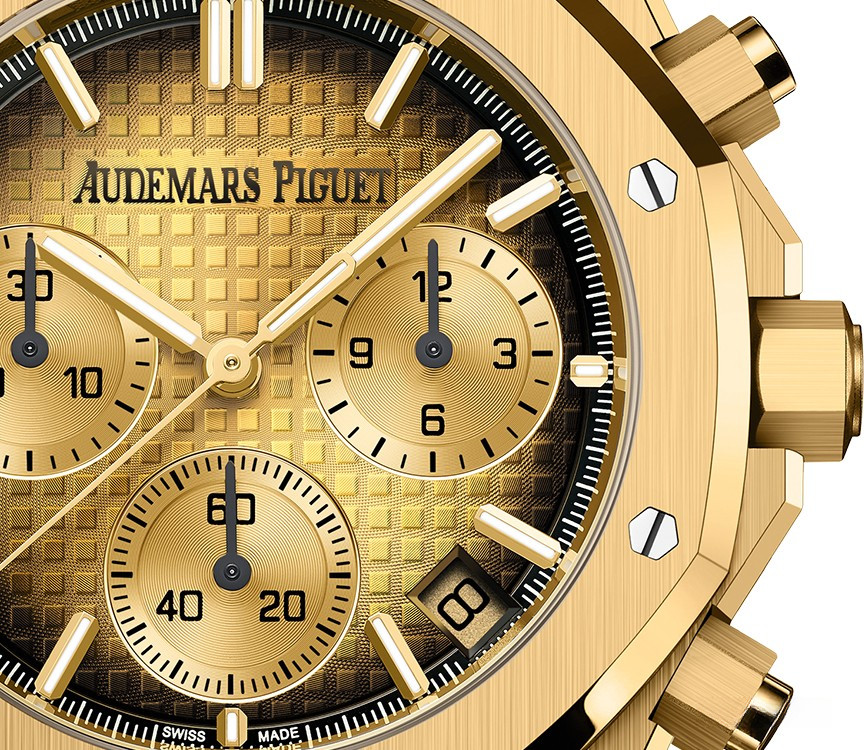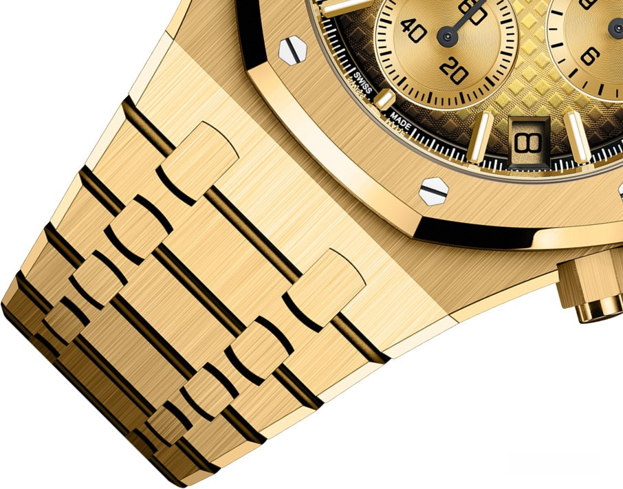Часы Audemars Piguet Royal Oak Chronograph выпущены в корпусе из желтого золота 18к, размером 41 х 12.4 мм и водонепроницаемостью 50 м. Внутри корпуса установлен автоматический механизм, Калибр 4401, обладающий запасом хода 70 часов. На золотистом гильошированном циферблате отображаются часы, минуты, дата, секунды, дата. Часы комплектуются браслетом из желтого золота 18к.