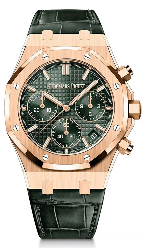 Часы Audemars Piguet Royal Oak Selfwinding Chronograph 41 mm 2022 представлены в корпусе размером 41 х 12.4 мм из розового золота 18к водонепроницаемостью 50 метров. Внутри корпуса установлен автоматический механизм, Калибр AP 4401, обладающий запасом хода 40 часов. На зеленом гильошированном циферблате отображаются часы, минуты, секунды, дата. Часы поставляются на ремешке из кожи аллигатора с застежкой из розового золота 18к.