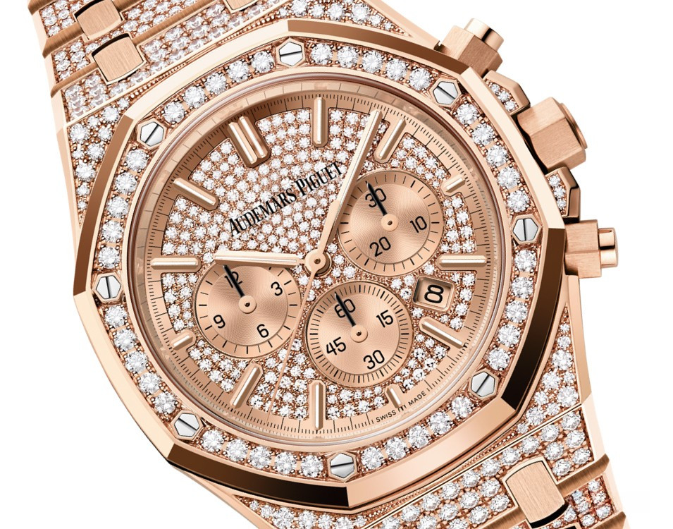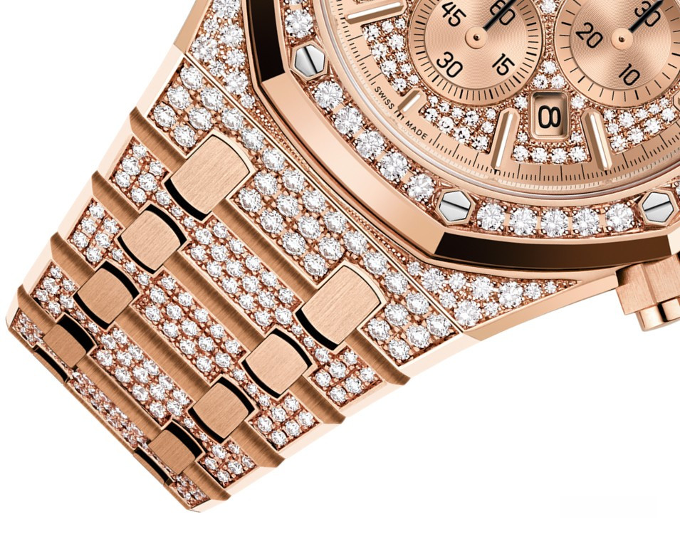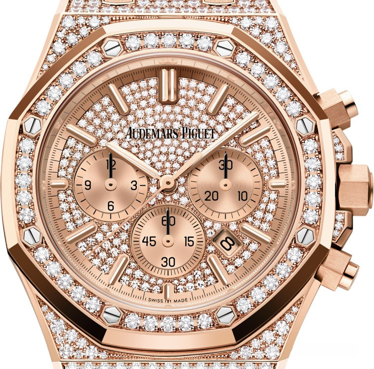 Часы Audemars Piguet Royal Oak Chronograph выпущены в корпусе из розового золота 18к, размером 41 х 11 мм и водонепроницаемостью 50 м. Внутри корпуса установлен автоматический механизм, Калибр 4401. На золотистом гильошированном циферблате с белыми бриллиантами отображаются часы, минуты, дата, секунды. Запас хода 70 часов. Часы комплектуются браслетом из розового золота 18к, инкрустированным белыми бриллиантами. Корпус инкрустирован белыми бриллиантами.